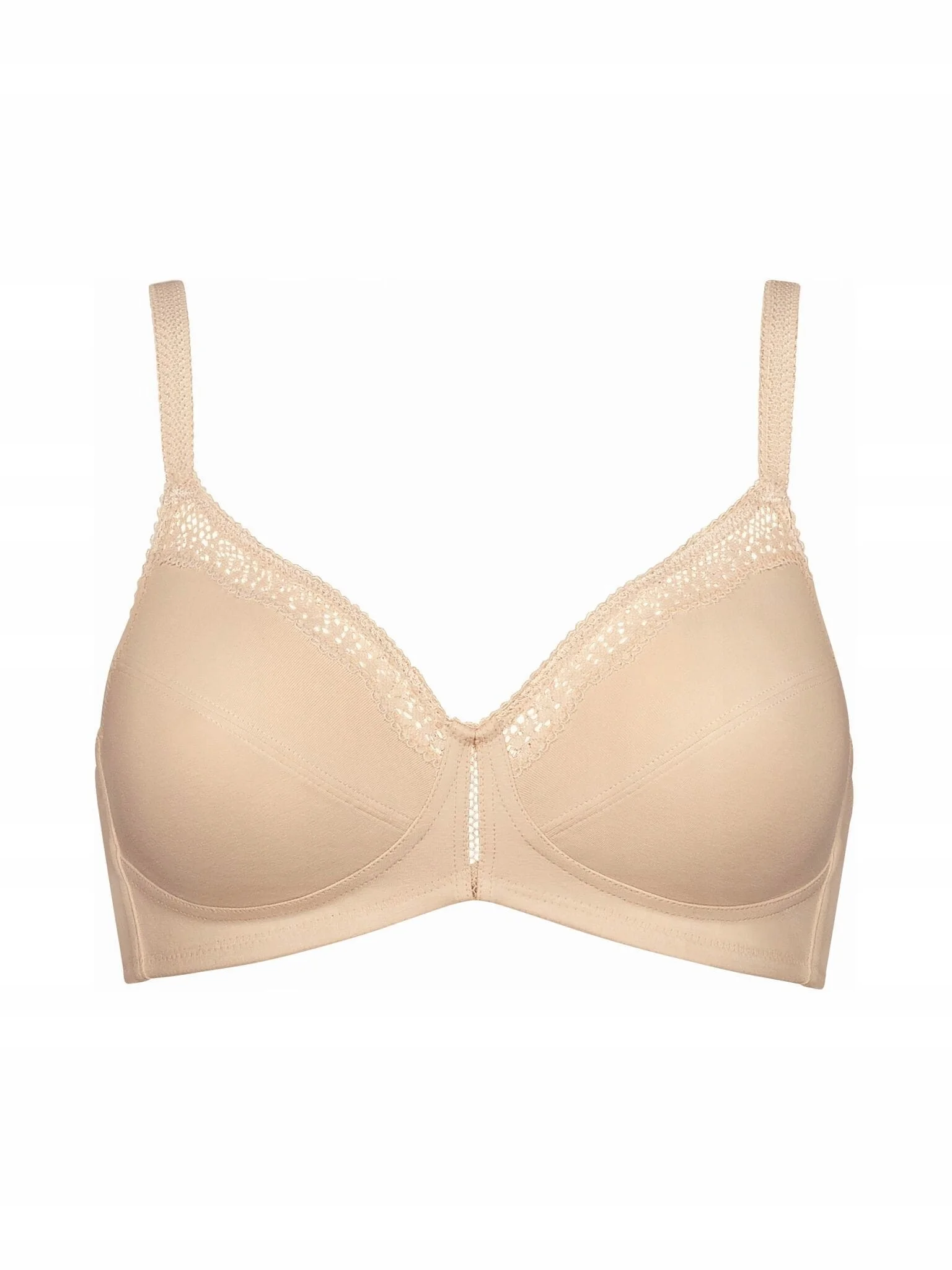 Navyztužená podprsenka bez kostíc z príjemného materiálu, vo výstrihu zdobené košíčky všitou jemnou čipkou. Materiálové zloženie: 80% bavlna, 10% polyamid, 10% elastan.