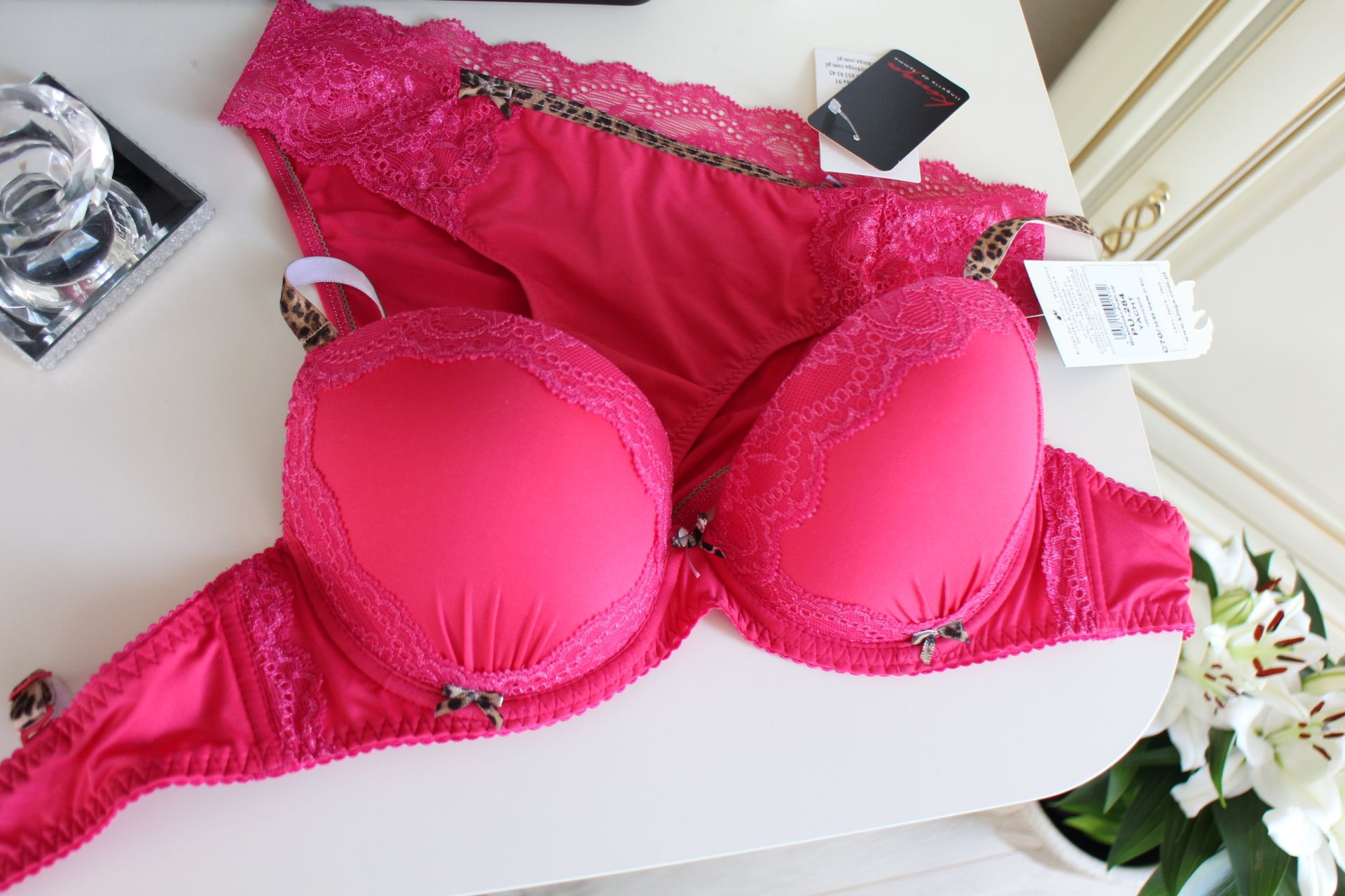 Obvod vášho poprsia [cm]Obvod vášho poprsia [cm]Správny obvod PohárikKošíček BKošíček CD košíčekMiska EMiska FMiska GMiska HMiska IMiska J 61-6563,5-67,566-7069-7371-7574-7876,5-80,579-8381,5-85,584-8886,5-90,560 66-7068,5-72,571-7574-7876-8079-8381,5-85,584-8886,5-90,589-9391,5-95,565 71-7573,5-77,576-8079-8381-8584-8886,5-90,589-9391,5-95,594-9896,5-100,570 76-8078,5-82,581-8584-8886-9089-9391,5-95,594-9896,5-100,599-103101,5-105,575 81-8583,5-87,586-9089-9391-9594-9896,5-100,599-103101,5-105,5104-108106,5-110,580 86-9088,5-92,591-9594-9896-10099-103101,5-105,5104-108106,5-110,5109-113111,5-115,585 91-95X96-10099-103101-105104-108106,5-110,5109-113111,5-115,5114-118116,5-120,590 96-100X101-105104-108106-110109-113111,5-115,5114-118116,5-120,5119-123121,5-125,595 101-105X106-110109-113 111-115114-118116,5-120,5119-123121,5-125,5124-128126,5-130,5100 106-110X111-115114-118116-120119-123121,5-125,5124-128126,5-130,5129-133131,5-135,5105 111-115X116-120119-123121-125124-128126,5-130,5129-133131,5-135,5134-138136,5-140,5110 116-120X121-125124-128126-130129-133131,5-135,5134-138136,5-140,5139-143141,5-145,5115 Nádherná dvojitá push-up podprsenka vo sviežej fuksiovej farbe, doplnená jemnou čipkou viditeľnou vo výstrihu, pôsobí žensky a sexi. Ramienka bez ramienok v zlatej a hnedej farbe, s mačacím vzorom. Na vnútornej strane košíčkov trvalé, veľké vypchávky zväčšujúce prsia, ktoré dokonale nadvihnú a vytvarujú, čo je potrebné. Vyberte si ju a v tejto sezóne budú vaše prsia vyzerať jednoducho skvele!Jeden z najlepších poľských výrobcov spodnej bielizne. Talianska, španielska alebo francúzska čipka. Najvyššia kvalita spracovania.