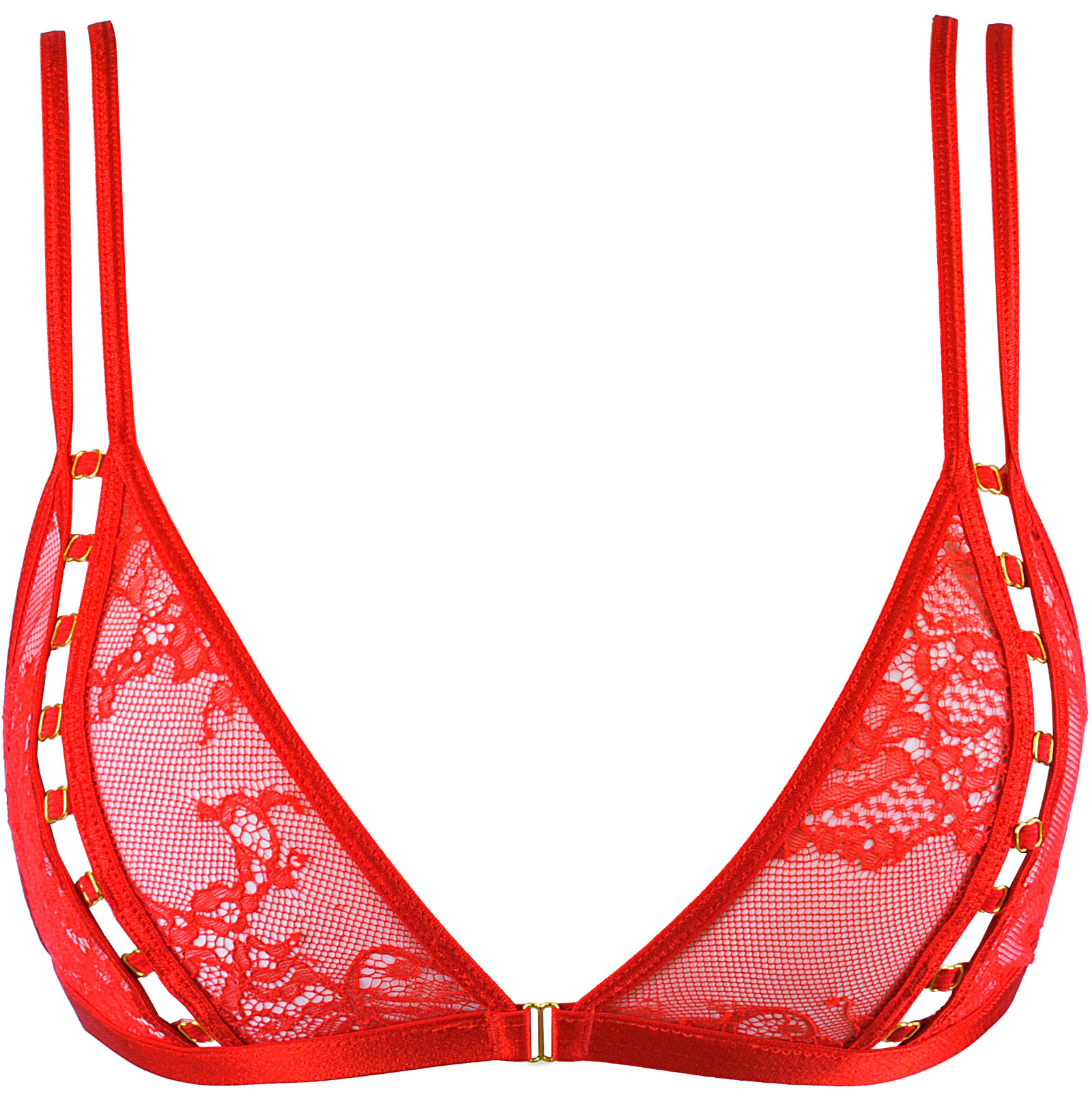 ?Červená čipkovaná braletka je zmyselná ponuka pre ženy, ktoré hľadajú eleganciu a jemnú provokáciu. Je vyrobená z jemnej, priehľadnej čipky so zaujímavými vzormi a upúta pozornosť svojím intenzívnym červeným odtieňom. Mäkké, nevystužené košíčky poskytujú prirodzený vzhľad a otvorené výrezy v strede, zdobené zlatými prvkami, dodávajú odvážny nádych.??Model je vybavený dvojitými nastaviteľnými ramienkami a nastaviteľným lemom pod prsiami pre dokonalé prispôsobenie . Jednoduché zapínanie na háčik a očko v zlatej farbe podčiarkuje luxusný charakter spodnej bielizne. Táto braletka je ideálnou voľbou pre ženy, ktoré oceňujú kombináciu klasického a moderného dizajnu, ktoré sa chcú cítiť výnimočne a sebaisto.100 % polyamid