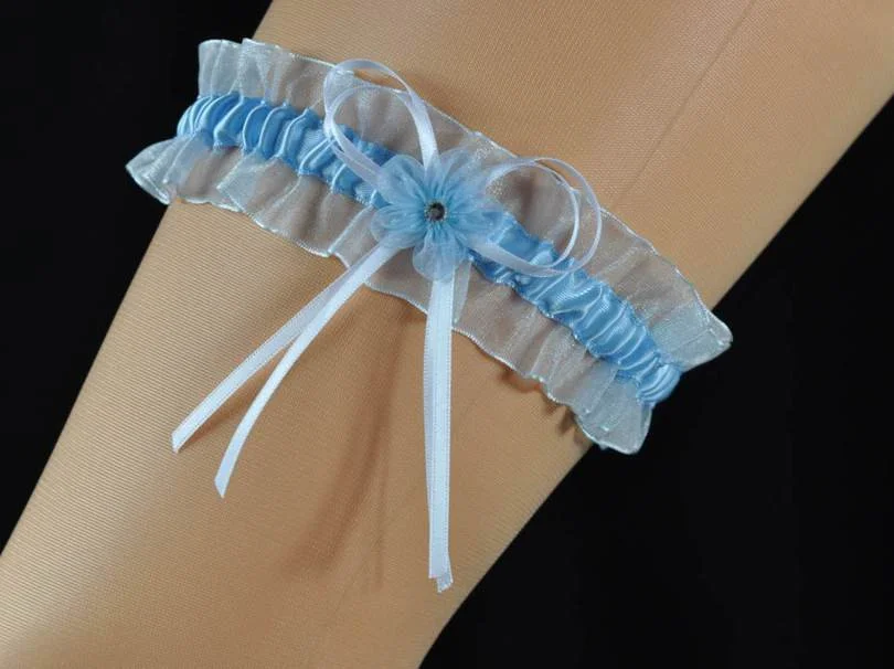 Modrý tylový a saténový podväzok zdobený kvetinovou mašľou s trblietavými flitrami.Zloženie: 90 % polyester, 10 % elastan. .