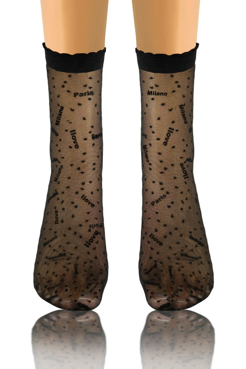 Podčiarknite svoj osobitý štýl s ponožkami WZ 09 PIKOT od značky Sesto Senso! Tieto priehľadné sieťované ponožky zdobí moderná potlač s nápismi "I love", "Milano" a "Paris", ktorá dokonale zapadá do mestskej módnej atmosféry. Roztomilý pás s volánikmi dodáva ponožkám dievčenský šarm a vďaka nemu sa perfektne hodia k teniskám aj elegantným topánkam. Vďaka vysokému obsahu polyamidu a elasticite poskytujú dokonalé prispôsobenie a pohodlie počas celého dňa.
