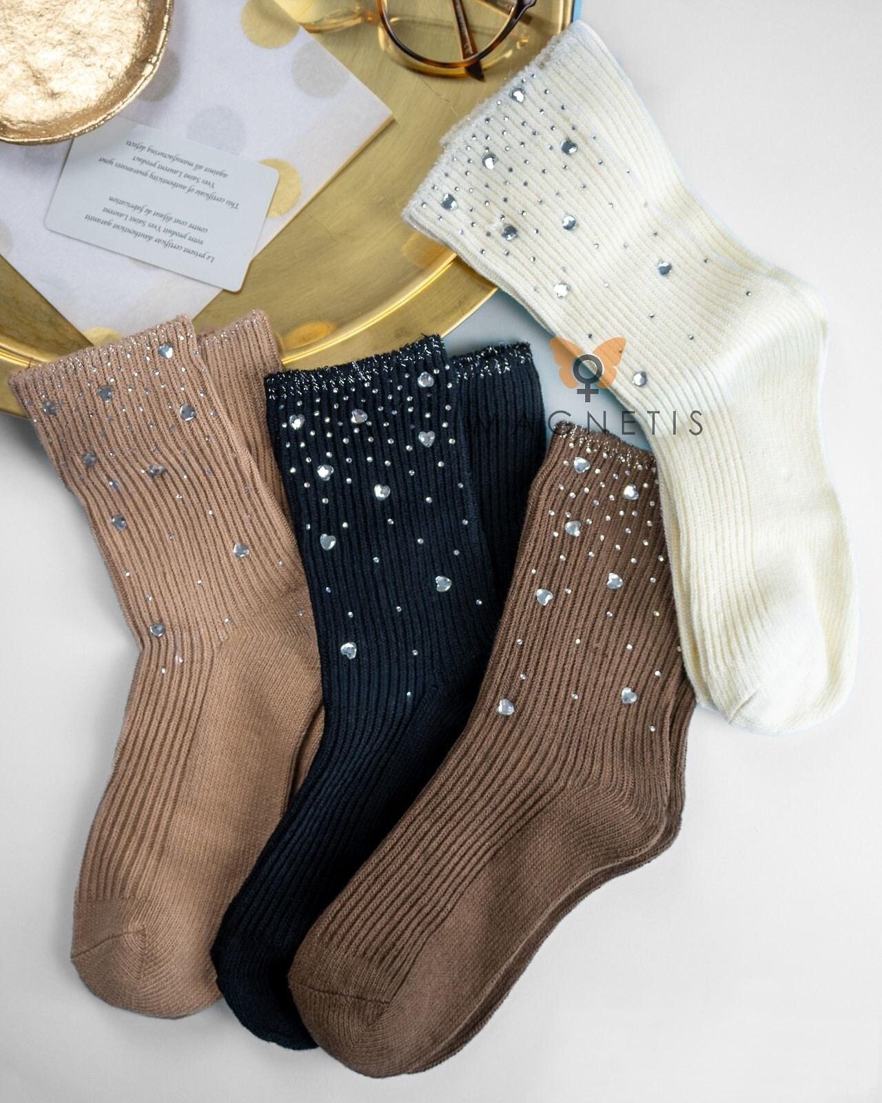 Dámske módne ponožky - mäkká pletenina - rebrovaný zvršok zdobený trblietavými kamienkami a trblietavými srdiečkami - netlačiaci lem - náhodne dostupné farby: ecru, béžová, moka, čierna Tkanina: 92 % bavlna, 8 % elastan
