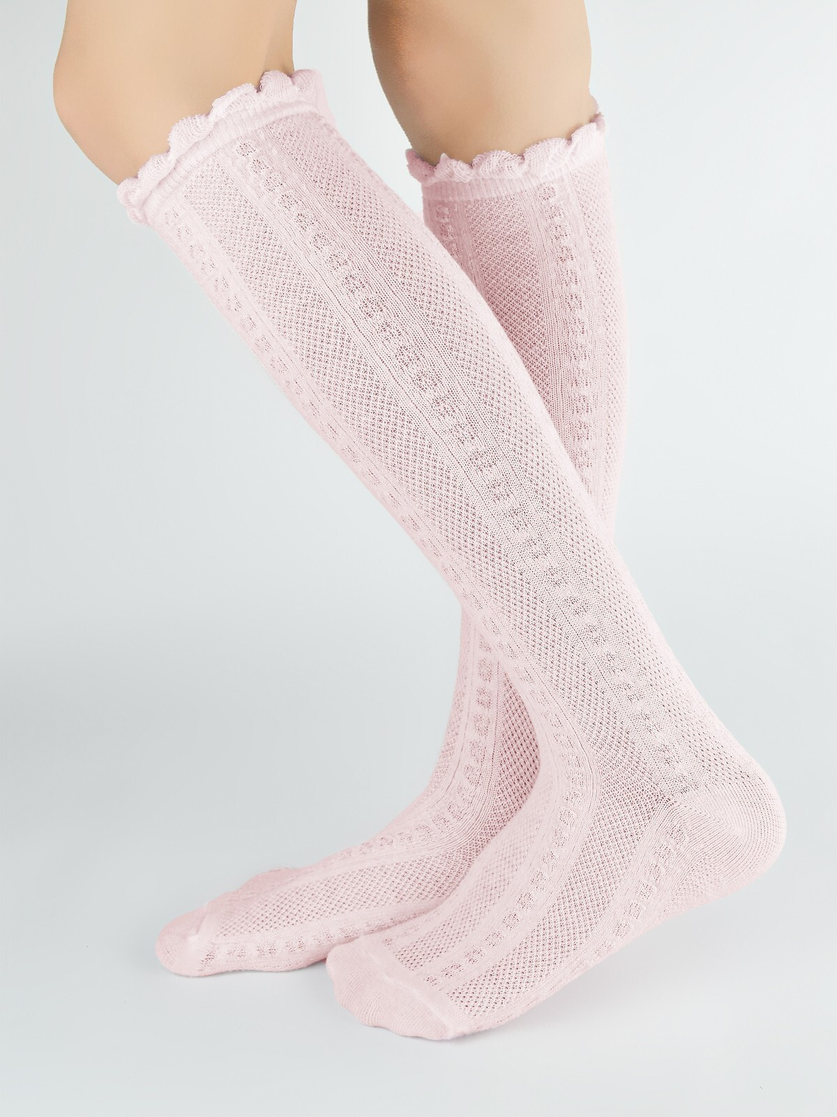 Dievčenské ponožky - mäkký úplet - jemný ažurový vzor - dostupné farby: ružová, ecru a biela - náhodne vybrané Zloženie: 72 % bavlna, 25 % polyamid, 3 % elastan