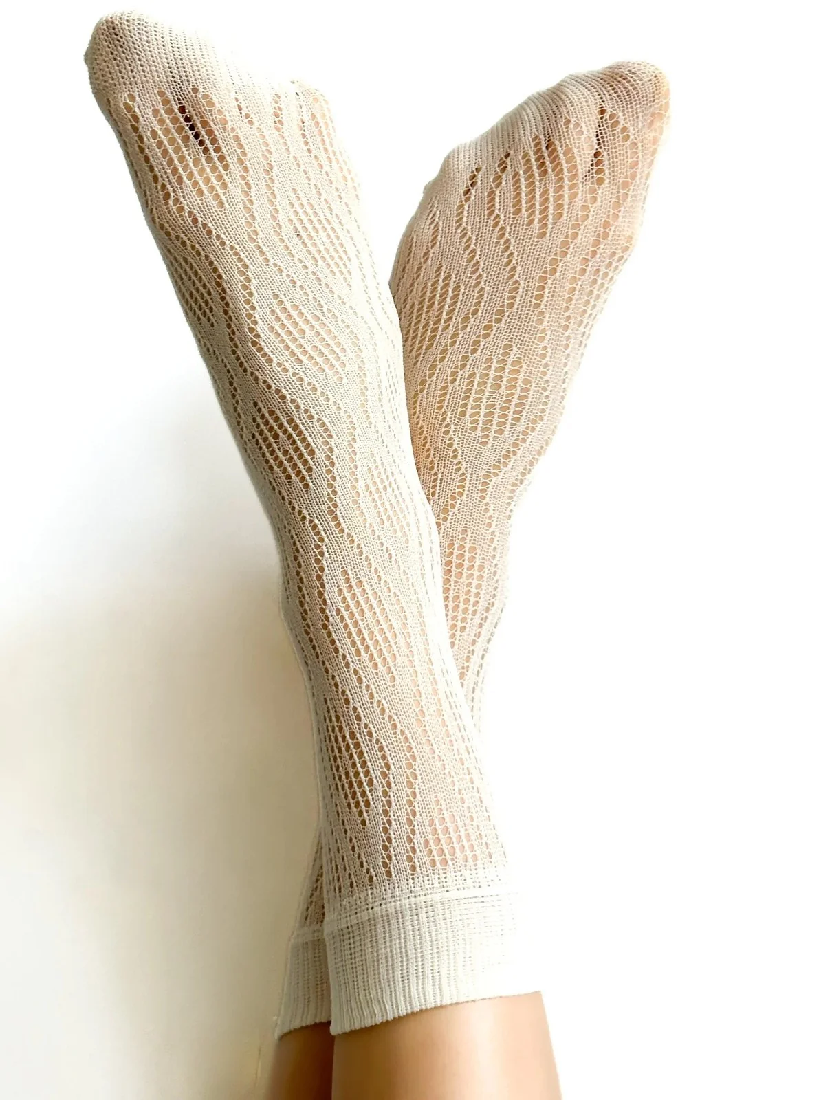 Dámske ponožky- zdobené ažurovým vzorom- nestlačiteľný pásZloženie: 90% polyamid, 10% elastan