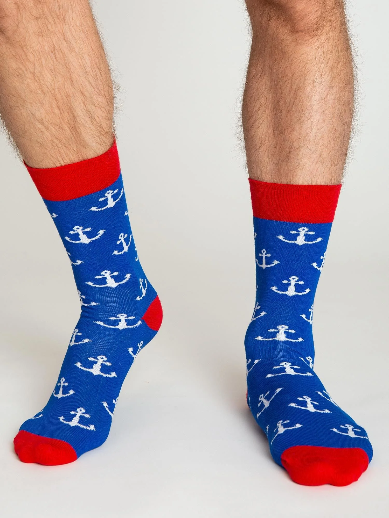 Pánske bavlnené ponožky s tmavomodrými vzormi. 80% česaná bavlna, 17% polyamid, 3% elastan spôsob prania: pranie v práčke pri 40 °C