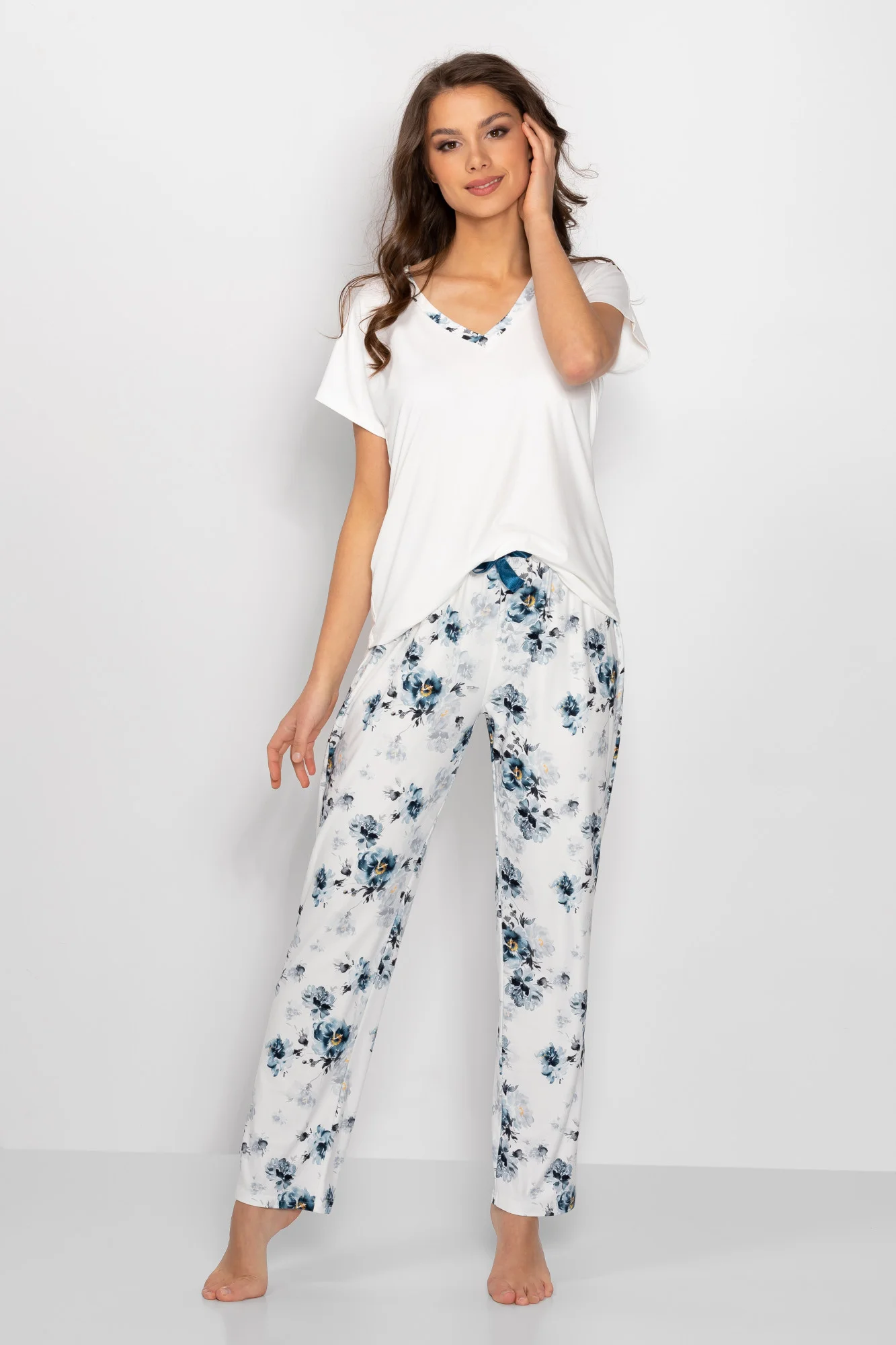 Dámske pyžamo pozostávajúce z blúzky a nohavíc. Blúzka s krátkymi rukávmi a špicatým výstrihom. Dlhé nohavice bez vreciek s ozdobnou mašľou v páse. Ideálne aj ako domáce oblečenie. Polyester 100% Veľkosť Obvod bedier Obvod pŕs Obvod v páse L 100-108 cm 90-94 cm 70-80 cm M 94-102 cm 86-90 cm 67-77 cm S 88-96 cm 82-86 cm 64-74 cm XL 106-114 cm 94-98 cm 73-83 cm
