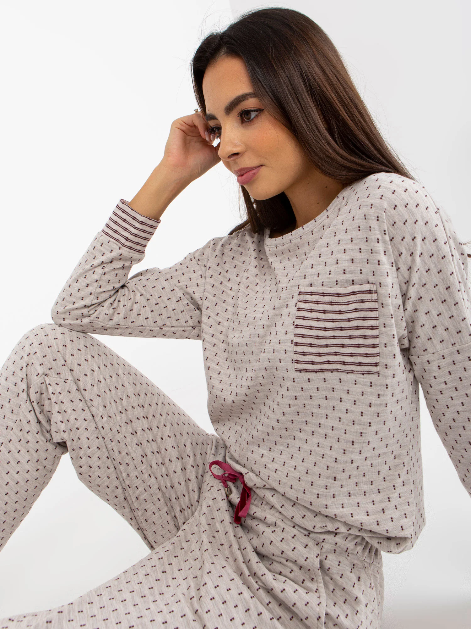 Svetlo béžové dvojdielne pyžamo s nohavicami . kód produktu: BR-PI-9114 dominantný vzor: geometrický Modelka má na sebe veľkosť S. Rozmery modelky: výška 175 cm, prsia 84 cm, pás 61 cm, boky 91 cm. Rozmery súpravy vo veľkosti S merané na plocho: šírka v podpazuší - 57 cm, dĺžka blúzky - 61 cm, dĺžka rukávov - 55 cm, šírka v páse - 35 cm, výška v páse - 32 cm, dĺžka nohavíc - 101 cm.Veľkosť Alt.VýškaObvod hrudníkaVonkajší. dĺžka. rukávVnútorný. dĺžka rukávovS36160-164825949M38162-172866151L40164-174916353XL42166-178966555