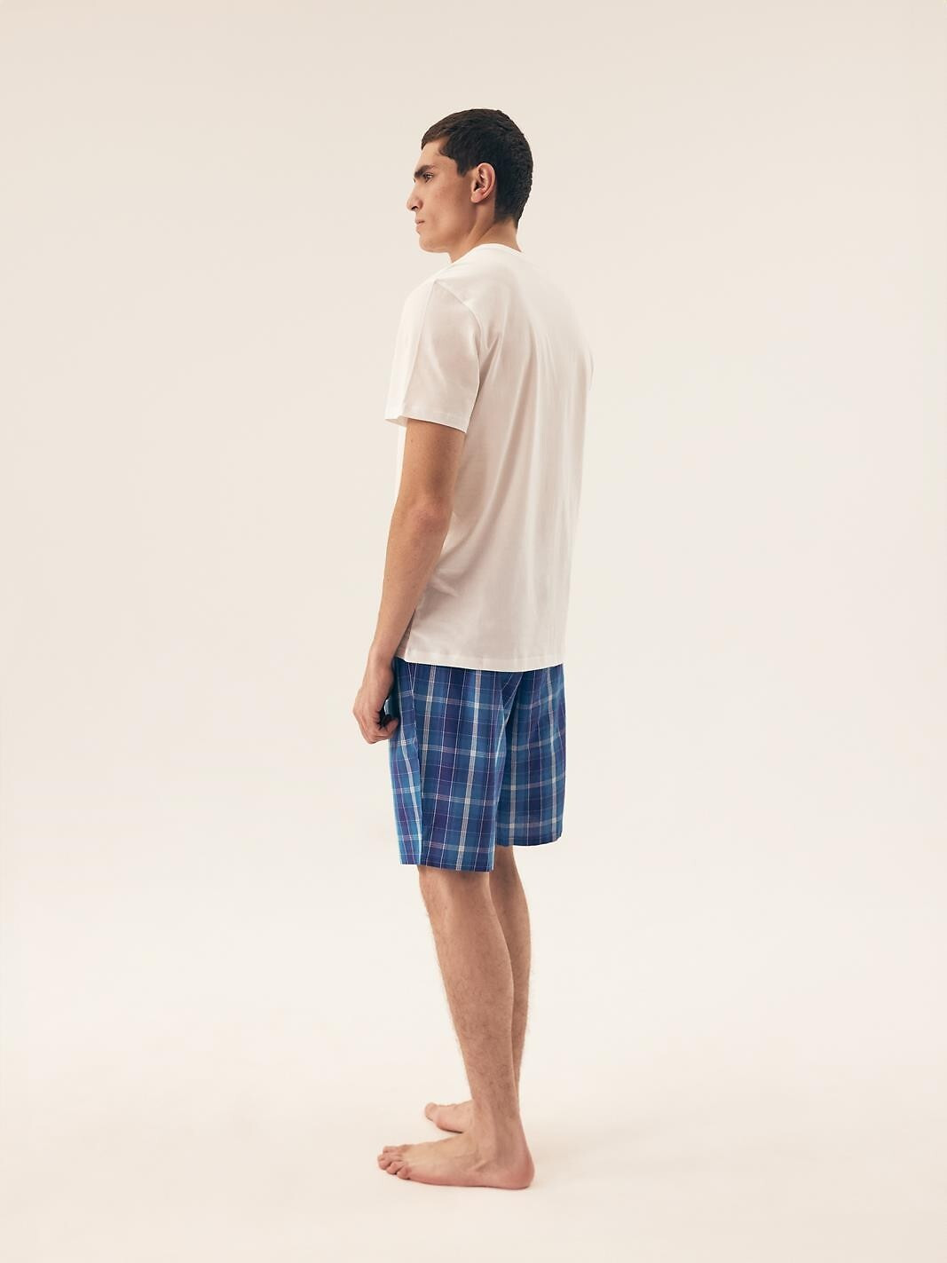 Pánske bavlnené pyžamo - pevná pletená košeľa - výstrih na tri gombíky - jemná potlač na hrudi - nohavice z jemnej bavlnenej károvanej tkaniny - dĺžka po kolená - elastický pás a šnúrka na úpravu pásu Zloženie: 100 % bavlna