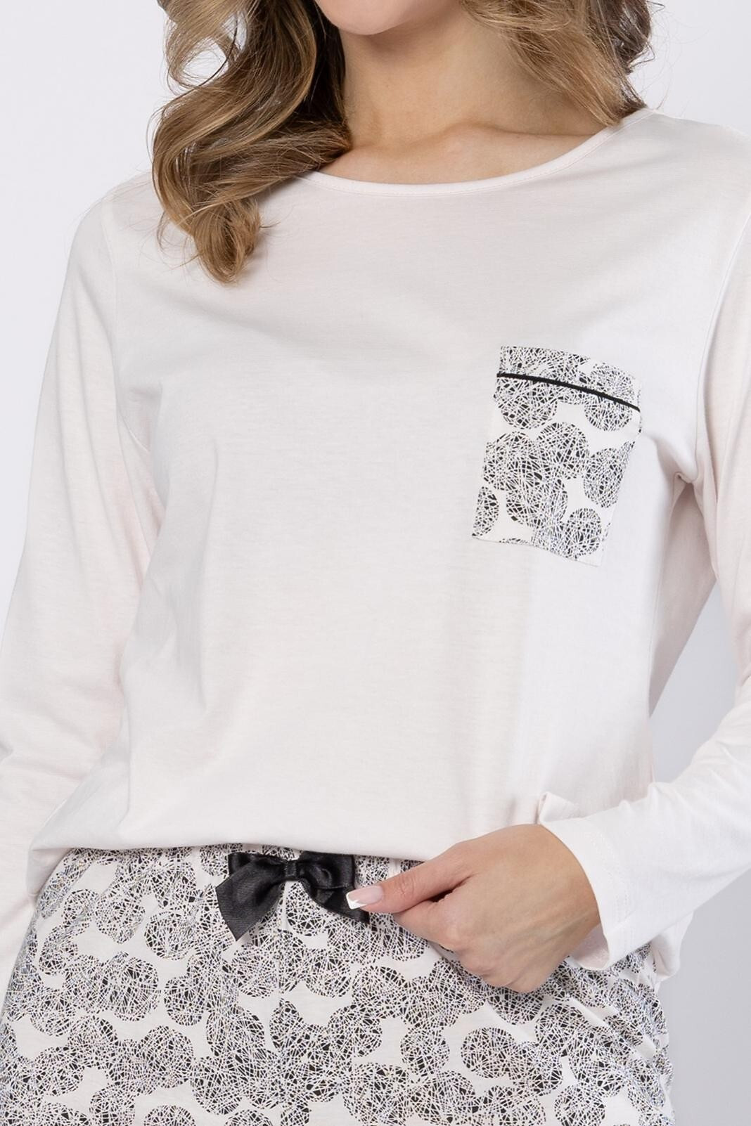 Dámske pyžamo - vysokokvalitná jemná bavlna - pevné tričko - všité náprsné vrecko - dlhé rukávy - dlhé vzorované nohavice - pohodlný elastický pás s čiernou mašľou Zloženie: 100 % bavlna