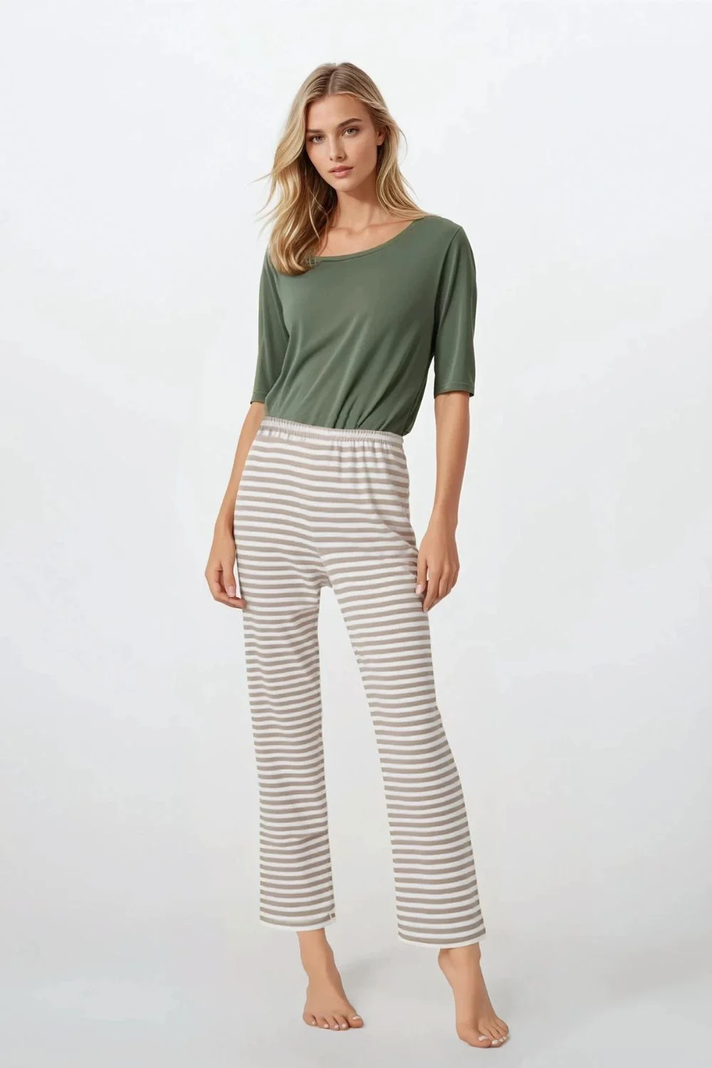 Dvojdielne pyžamo s elegantným strihom, vytvorené s ohľadom na pohodlie a ženský pôvab. Okrúhly výstrih a 3/4 rukávy dodávajú jemný pôvab, zatiaľ čo voľný, pohodlný strih poskytuje úplnú voľnosť pohybu. Rovné nohavice a širšie nohavice vytvárajú harmonický celok, ktorý je nielen pohodlný, ale aj elegantný. Pyžamo je vyrobené z prírodných materiálov a zaručuje vysokú kvalitu a hypoalergénne vlastnosti, takže je ideálnou voľbou aj pre citlivú pokožku. Elastický pás zaručuje, že sa model dokonale prispôsobí postave a poskytne pohodlie počas celej noci. Pyžamo je navrhnuté a ušité v Poľsku a je skvelou voľbou na domáce nosenie aj ako darček Veľkosť Obvod pása Obvod cez prsia Obvod pása L97-102 cm93-98 cm73-78 cmM91-96 cm87-92 cm68-73 cmS85-90 cm82-86 cm63-68 cmXL103-108 cm99-104 cm78-83 cmXXL109-114 cm105-110 cm83-88 cm