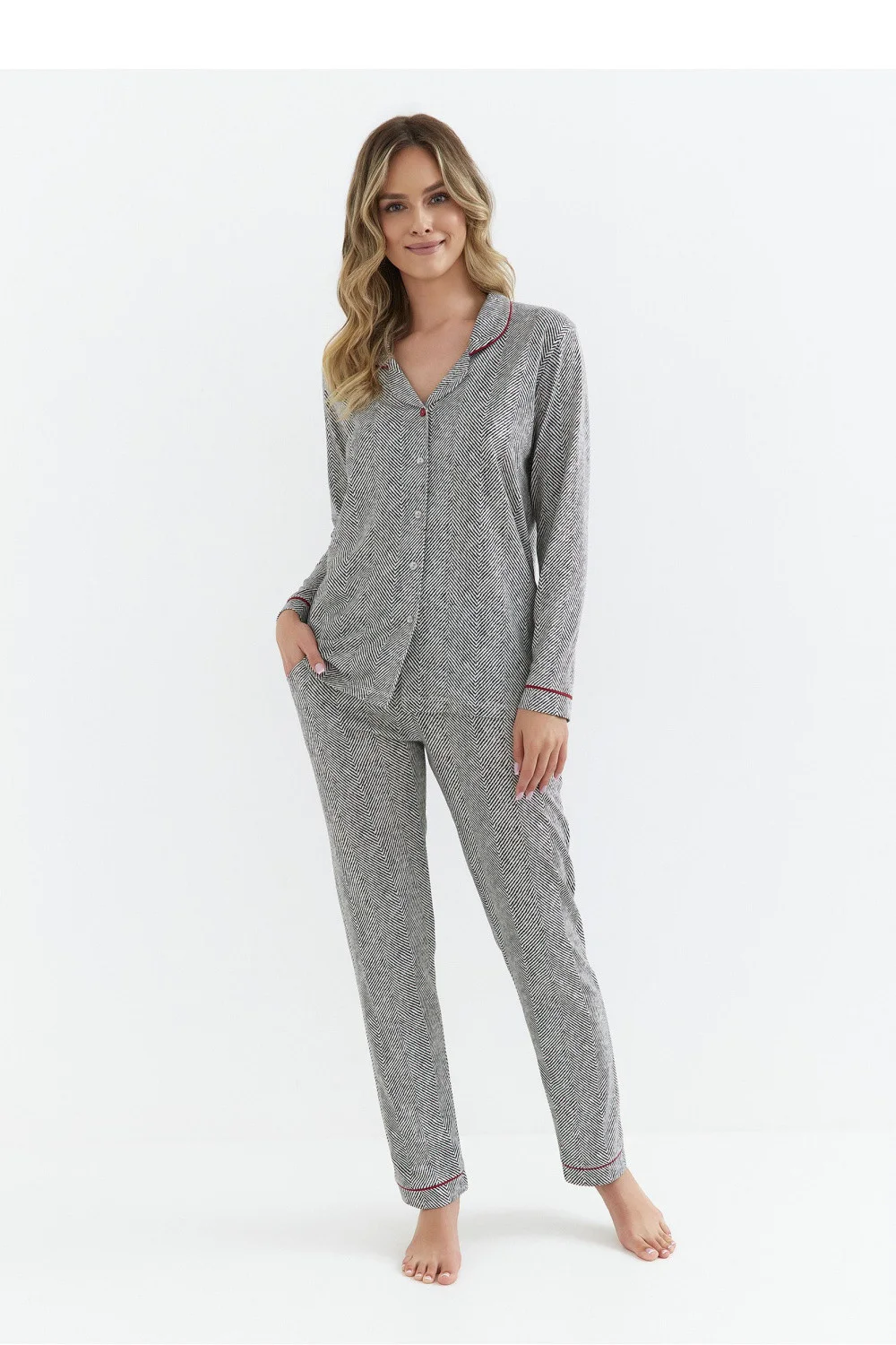 Toto elegantné dámske pyžamo v štýle košele je ideálnou kombináciou elegancie a pohodlia. Je vyrobené z mäkkej, priedušnej tkaniny s potlačou a poskytuje celonočné pohodlie. Košeľa s dlhými rukávmi má klasický golier a zapína sa na gombíky, čo dodáva celému kúsku elegantný charakter. Elegantné detaily lemovania podčiarkujú starostlivý dizajn. Voľný strih zaručuje voľnosť pohybu a dlhé nohavice s praktickými vreckami zabezpečujú pohodlie pri nosení. Celá kolekcia je zabalená vo fóliovom vrecku, takže je skvelým darčekom. 100 %bavlna Veľkosť Obvod pása Obvod hrudníka L108 cm100 cmM100 cm92 cmXL116 cm108 cmXXL124 cm116 cm