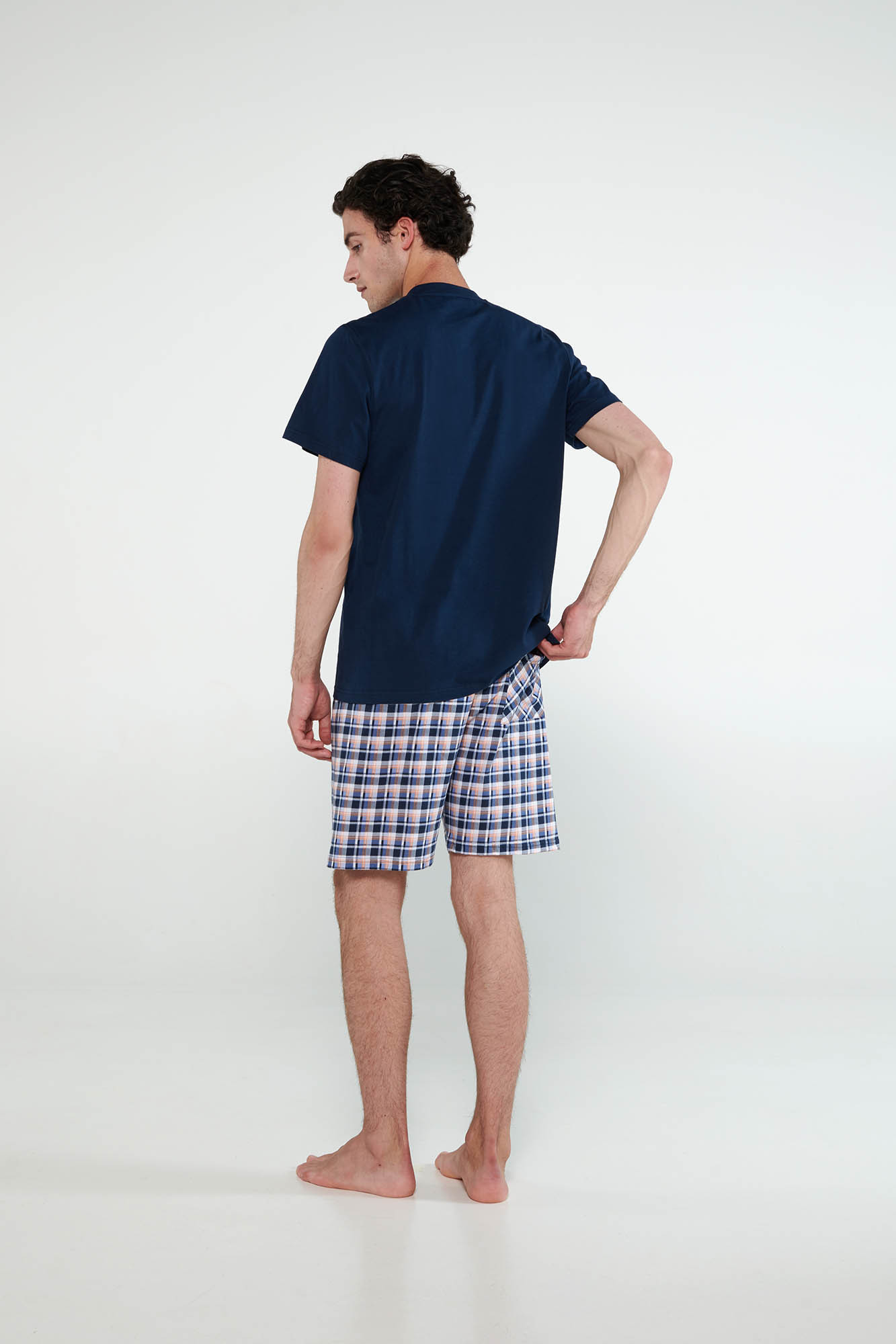 100% bavlna S. Jersey Model: výška 185 cm, veľkosť: medium. Pánske pyžamo s krátkym rukávom, zapínaním na gombíky a krátkymi nohavicami. Svieže letné farby a tenká bavlna v károvanom dizajne s oranžovými detailmi.