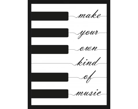 Obraz v drevenom čiernom ráme, zaujme štýlovým hudobným motívom. Anglický text Make your own kind of music na pozadí klávesov klavíra, poteší každého milovníka muziky. Kombinácia s ďalšími obrazmi škandinávskeho štýlu vytvorí na stene originálnu koláž. Rozmer 30x40 cm.
