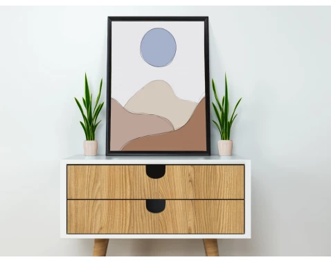 Obraz v čiernom drevenom ráme s motívom krajiny a mesiaca v škandinávskom a boho štýle. Vytvára útulnú atmosféru v obývačke, spálni alebo pracovni.