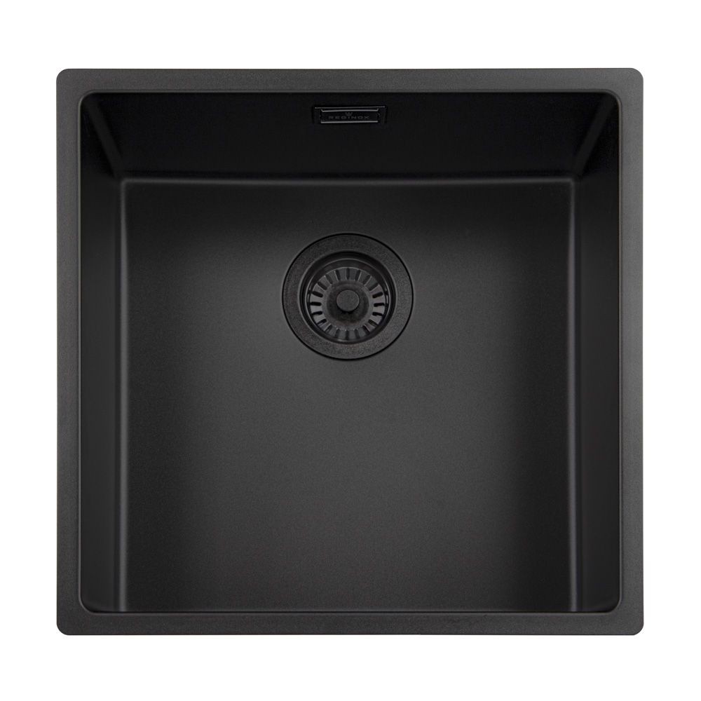 Nerezový drez 40x40 cm, čierny povrch Jet Black, montáž horná / do roviny / spodná Materiál: Nerezová oceľ 304 Hrúbka materiálu: 0,9 mm Povrchová úprava: čierna Jet Black Montáž: horná / do roviny / spodná Pri spodnej montáži je nutné doobjednať úchytky R18996 Obsahuje odpadovú sadu bez excentra (ručné ovládanie výpustu) Sifón nie je súčasťou dodávky (možno doobjednať pod označením R18934) Vnútorné rozmery vaničky (ŠxHxV): 403 x 403 x 180 mm Celkové rozmery drezu (ŠxHxV): 440 x 440 x 180 mm Rádius: 10 mm Minimálna šírka skrinky: 500 mm(GT) Ean: 8712465034255