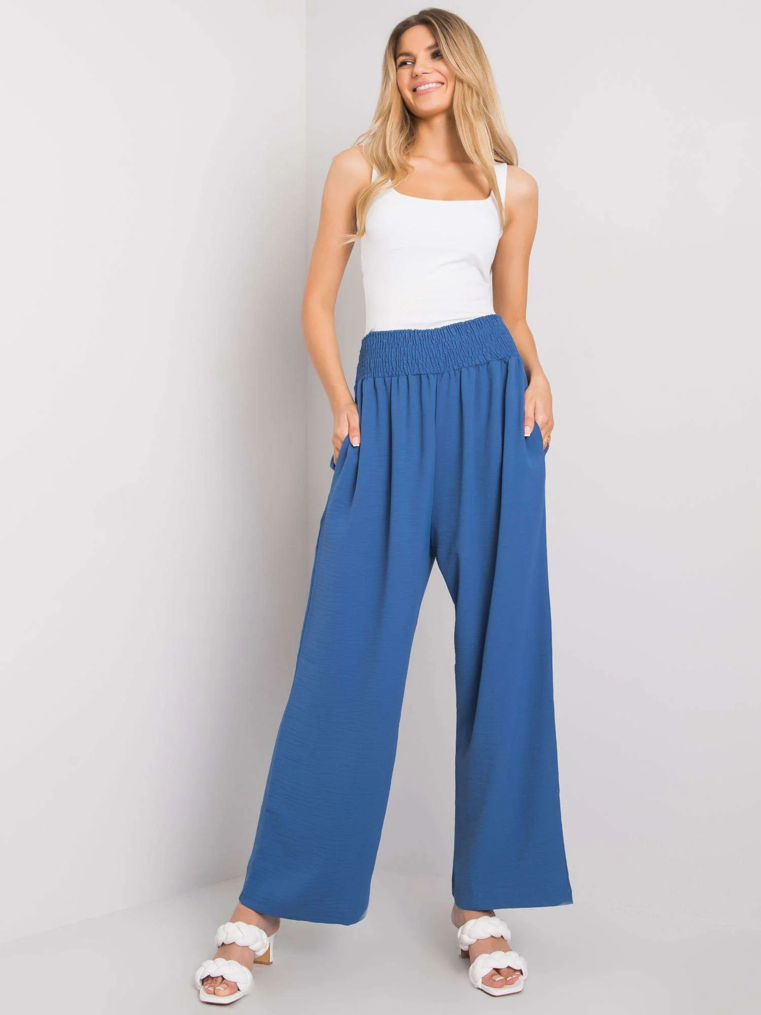 RUE PARIS Tmavomodré látkové nohavice s vysokým pásom . Zloženie materiálu: 95% polyester, 5% elastan spôsob prania: pranie v práčke na 30 °C Modelka má na sebe veľkosť S. Rozmery modelky: výška 179 cm, prsia 86 cm, pás 62 cm, boky 88 cm. Veľkosť nohavíc S merané na plocho: šírka v páse - 36 cm, celková dĺžka - 105 cm, výška v páse - 43 cm Medzinárodná veľkosť Výška Obvod pása Obvod bokov Vonkajšia dĺžka nohavíc Dĺžka vnútornej nohavice S 36 160-168 72-80 90 87 74 M 38 162-172 78-86 94 90 75 L 40 164-174 84-90 102 94 76