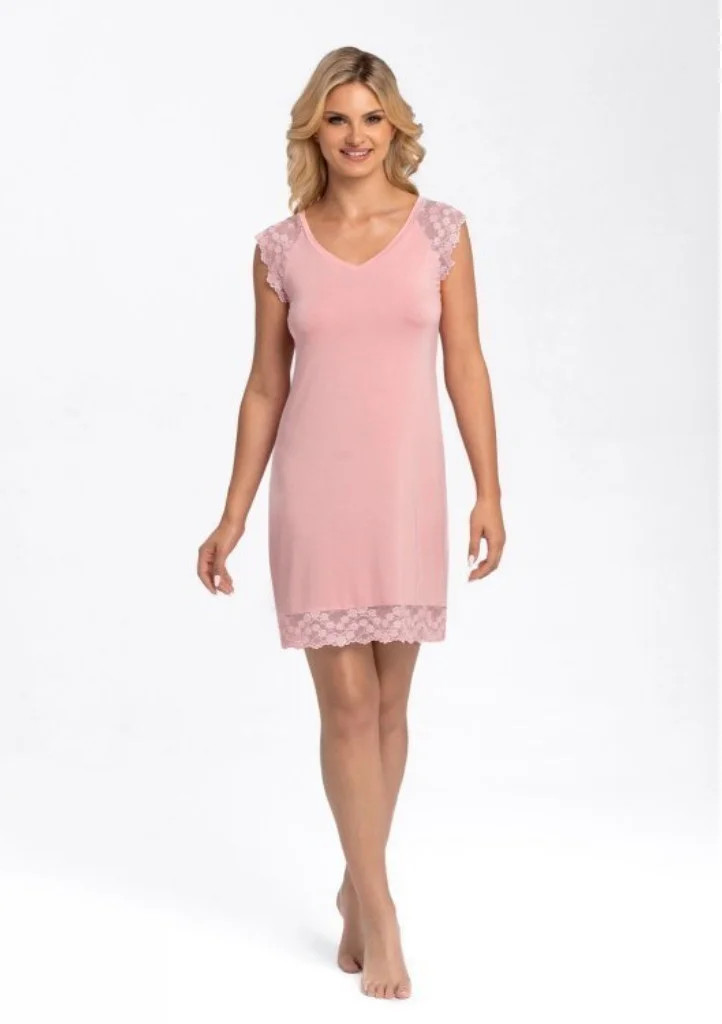 Dámska nočná košeľa značky Babella. Chcete na svojho partnera zapôsobiť v nočnej košeli? Nočná košeľa Babella je vyrobená v elegantnom strihu z jemného viskózového materiálu. Nočná košeľa má výstrih do V, oblasť ramien je zdobená jemnou čipkou, rovnako ako spodná časť prednej časti nočnej košele. 94 % viskóza, 6 % elastan.
