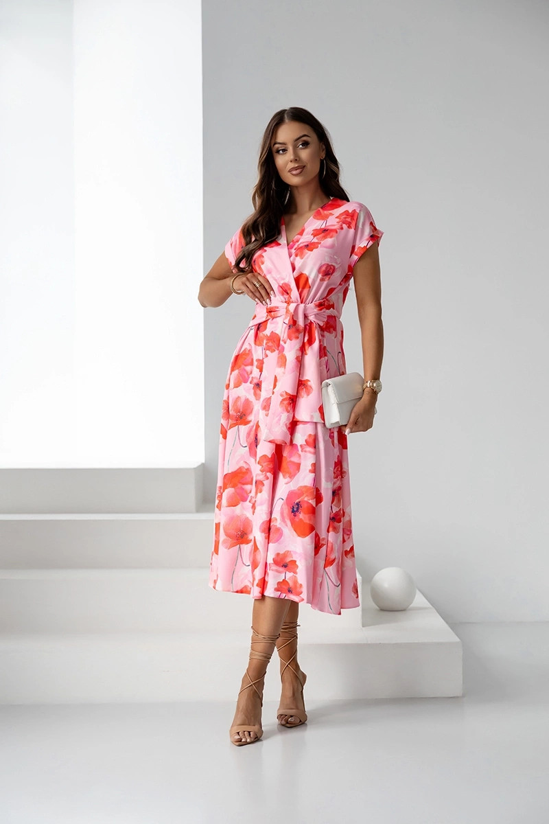 Pri výbere veľkosti venujte pozornosť nižšie uvedenej veľkostnej tabuľke. Veľkosti nezodpovedajú bežne nosenému oblečeniu. Šaty s krátkymi rukávmi Šaty majú preložený obálkový výstrih. Rukávy sú netopierieho typu. V páse je elastický pás a šnúrka na stiahnutie. Spodná časť šiat je jednoduchá a siaha pod kolená. Šaty sú poľským výrobkom. Zloženie: 65 % polyester, 35 % viskóza.