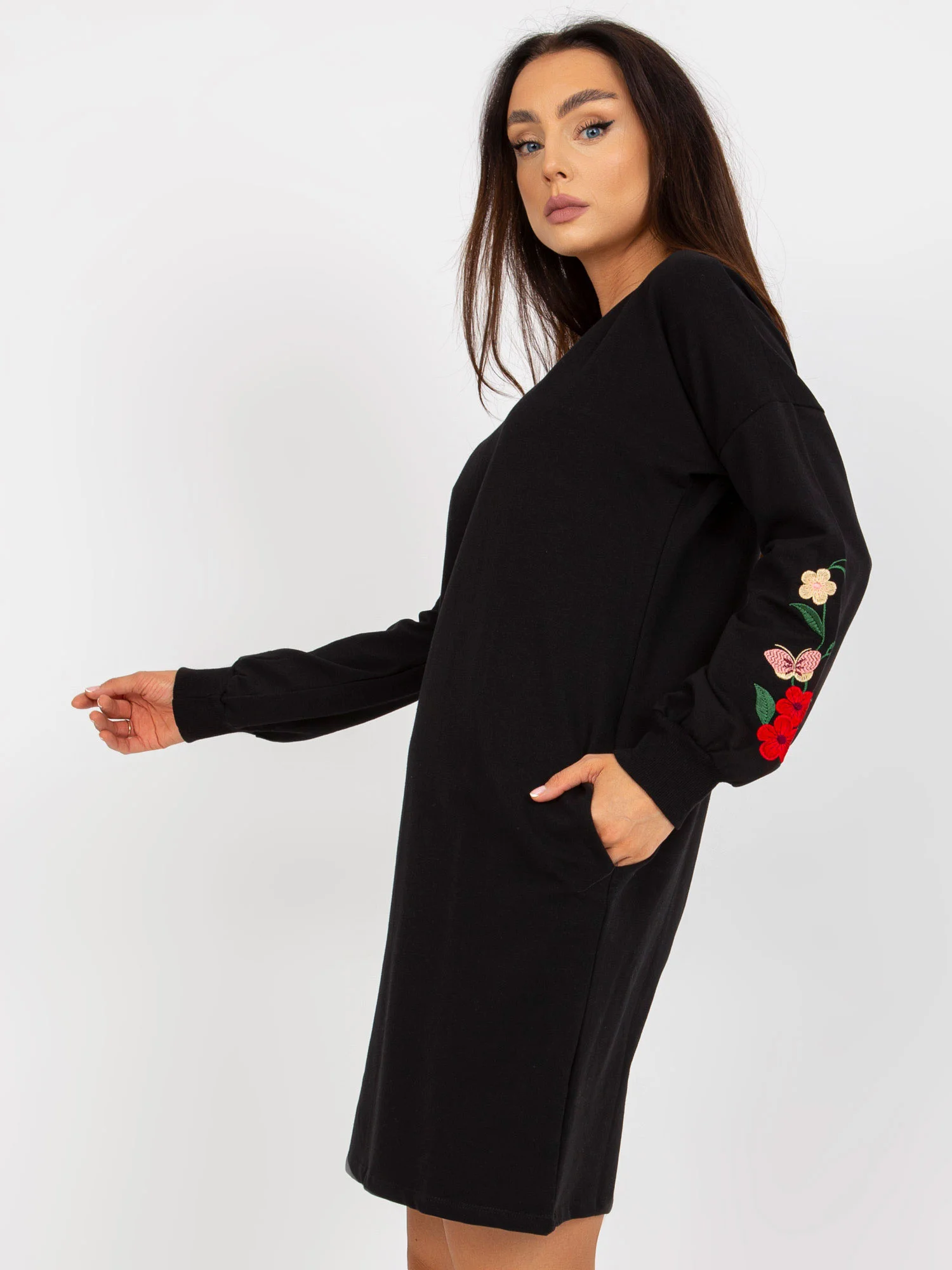 Čierne mini teplákové šaty s výšivkou RUE PARIS .doplnky: vreckámateriálové zloženie: 90 % bavlna, 10 % elastanspôsob prania: pranie v práčke pri 30 °CKód produktu: RV-SK-8088.59dominantný vzor: jednofarebnýštýl: ležérnypríležitosť: ležérne, pracovné, na vychádzky, letné Modelka má na sebe veľkosť S/M. Rozmery modelky: výška 171 cm, prsia 84 cm, pás 60 cm, boky 88 cm.Rozmery šiat vo veľkosti S/M merané na plocho: šírka v podpazuší - 58 cm, celková dĺžka - 90 cm, dĺžka rukáva - 56 cmMedzinárodná veľkosťVýškaObvod hrudníkaObvod pásaS/M36-38160-17282-8672-86L/XL40-42164-17891-9684-96