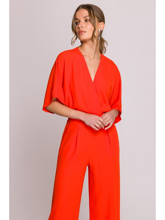 S395 Kombinéza so širokými nohavicami a zavinovacím výstrihom - koralová EU S