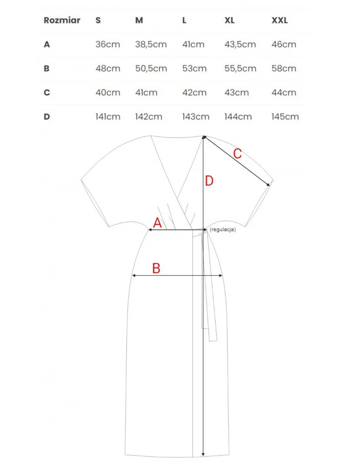 materiál: ľahká viskóza Povrchová úprava: hladký, satén PODROBNOSTI O VÝROBKU Pás: klasický strih s opaskom na zvýraznenie pásu Zapínanie: zaväzovanie v páse, zavinovací strih Rukávy: voľné, dĺžka po lakte Vrecká: žiadne Model: S406 Navrhnutý a vyrobený v Poľsku Modelka je vysoká 170 cm a má na sebe veľkosť S STYLE A STRIH Strih: zavinovací strih Tvar: stiahnutý pás, splývavý pozdĺž tela Dĺžka: maxi dĺžkaVEĽKOSŤSMLXLXXLA36 cm38,5cm41cm43,5cm46cmB48cm50,5cm53cm55,5cm58cmC40cm41cm42cm43cm44cmD141cm142cm143cm144cm145cm