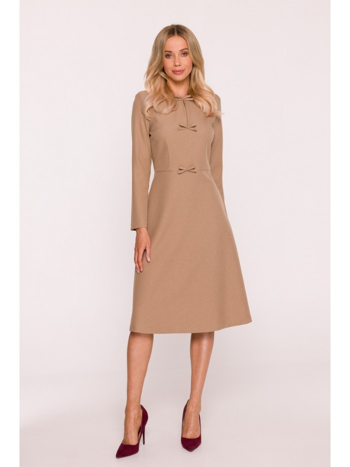 materiál: 97% polyester 3% elastan Textília: hladká tkaná tkanina s melanžovou štruktúrou PODROBNOSTI O PRODUKTE Výstrih: okrúhly výstrih s rozparkom vpredu Rukávy: dlhé Vrecká: vrecká v bočnom šve Detail: ozdobné mašle v strede predného dielu Zapínanie: skrytý zips vzadu Podšívka: žiadna Model: S413 Navrhnuté a vyrobené v Poľsku Modelka je vysoká 174 cm a nosí veľkosť S STYLE A STRIH Strih: trapézové šaty s ozdobnými mašľami vpredu Tvar: uvoľnená áčková línia, voľnejšie na bokoch Dĺžka: pod kolenáVEĽKOSŤSMLXLXXLA38 cm39 cm40 cm41cm42cmB46cm48,5cm51cm53,5cm56cmC37cm39,5cm42cm44,5cm47cmD50cm52,5cm55cm57,5cm60cmE58cm58cm59cm59cm59,5cmF110cm111,5cm113cm114,5cm116cm