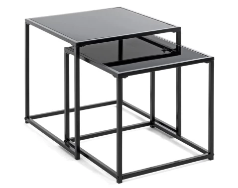Súprava 2 kusov rôzne veľkých stolíkov z kombinácie čierneho kovu a čierneho skla sa parádne hodí k modernej sedačke. Väčší a menší stolík môžete využiť spoločne alebo ich rozmiestni kamkoľvek do priestoru obývacej izby, kde prakticky poslúžia napríklad ako odkladacie stolíky na lampičku, dekorácie alebo kvety. Záleží len na vás. Menší stolík je možné zasunúť pod väčší a ušetriť tak priestor.