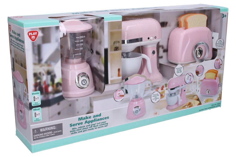 Súprava spotrebičov. Obsahuje mixér, kávovar a hriankovač. Veľkosť mixéra 17 cm, šľahača 15 cm a hriankovača 15 cm. 2xAA pre mixér a 2xAA pre šľahač nie sú súčasťou dodávky. Miešajte, šľahajte alebo opekajte. Predveďte svoje kuchárske zručnosti s touto dokonalou kuchynskou súpravou v nádhernej ružovej farbe. Ozdobte svoju kuchyňu v modernom štýle! Spotrebiče fungujú ako skutočné, vyskúšajte ich všetky. Súprava obsahuje hriankovač, mixér, kuchynský robot. Svetelné a zvukové efekty. Odporúčaný vek: od 3…