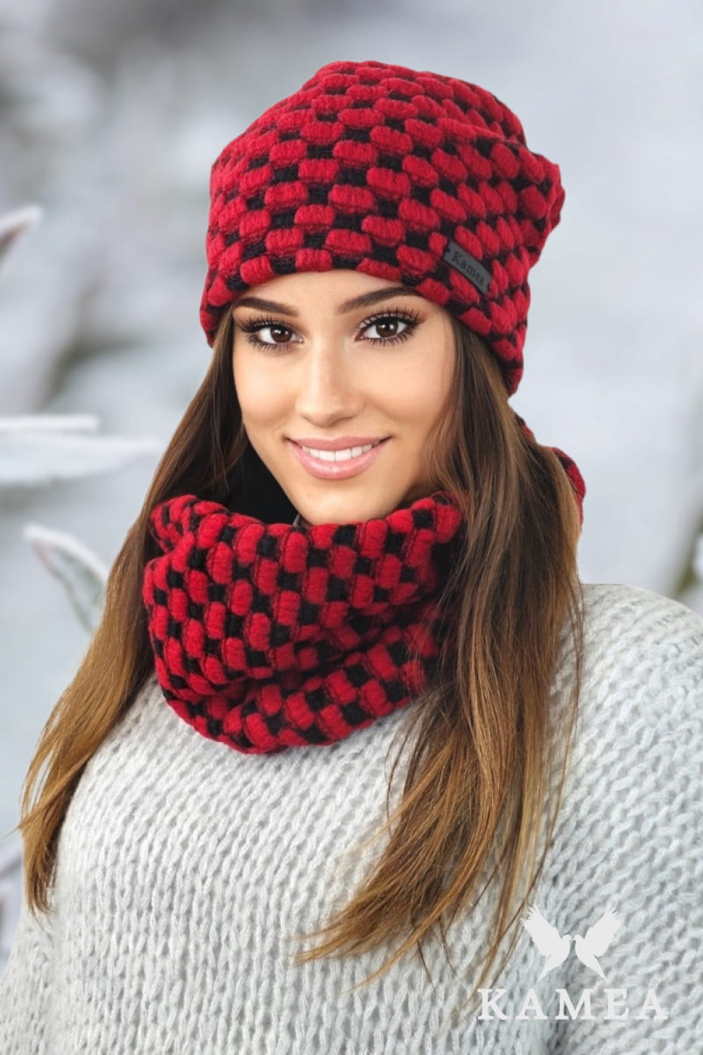 BOSTON zimná sada v červenej farbe je ideálnym riešením pre chladné dni. Skladá sa z čiapky s lemovaním z plyšu a tubáku. Vyrobené z vysoko kvalitnej priadze, poskytujúce pohodlie a teplo. Čiapka je zdobená logom z ekokože, čo jej dodáva eleganciu. Produkt určený na jeseň a zimu, k dispozícii v rôznych farbách. Ideálna voľba pre každú ženu, ktorá si cení nielen štýl, ale aj funkčnosť. Zloženie 53 % vlna; 25 % polyester; 22 % akryl.