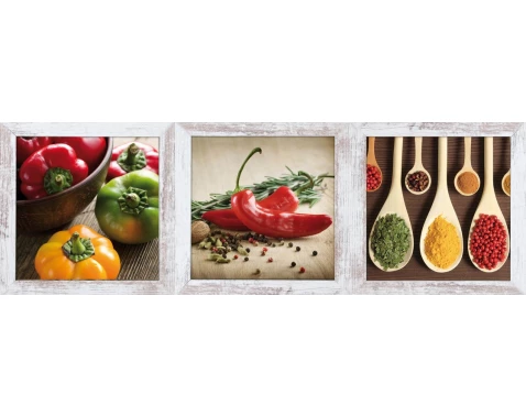 Dekoratívna rámovaná súprava 3 obrazov na stenu, ktoré vytvoria dokonalý celok vedľa seba alebo nad sebou. Motív korenia sa hodí do kuchyne alebo jedálne.