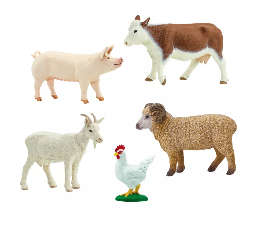 Balíček replík zvierat pomenovaný „Statok“ obsahuje päť modelov hospodárskych zvierat: kravu, sliepku, kozu, barana a prasnicu. Každá figúrka má uvedené výrobné označenie a orientačné rozmery.