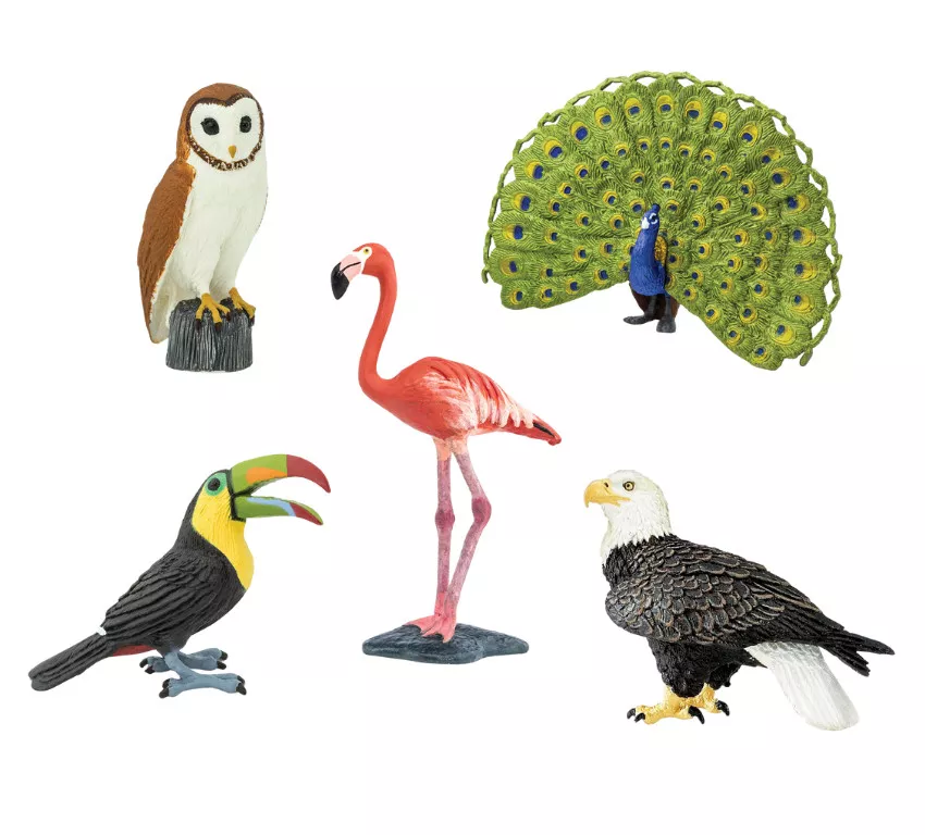 Set obsahuje päť kvalitne spracovaných figúrok vtákov: tukana, sovu, plameniaka, orla bielohlavého a pava. Figúrky značky Safari Ltd. sú ručne spracované a netoxické; neobsahujú olovo, škodlivé chemikálie, ftaláty ani BPA. Vhodné pre deti od 3 rokov.