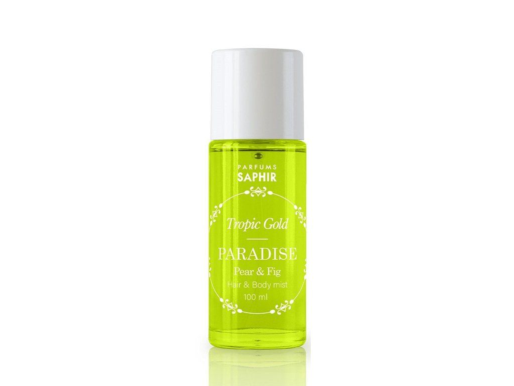 Dopraj svojmu telu aj vlasom sladký dotyk exotiky – ľahký parfumovaný sprej Saphir Paradise očarí dominantným figom a hruškou, ktoré zanechávajú každý okamih voňavo nezabudnuteľný. Vďaka jemnej textúre sa ľahko aplikuje na telo aj vlasy a dodáva pocit hebkosti a hrejivej elegancie.