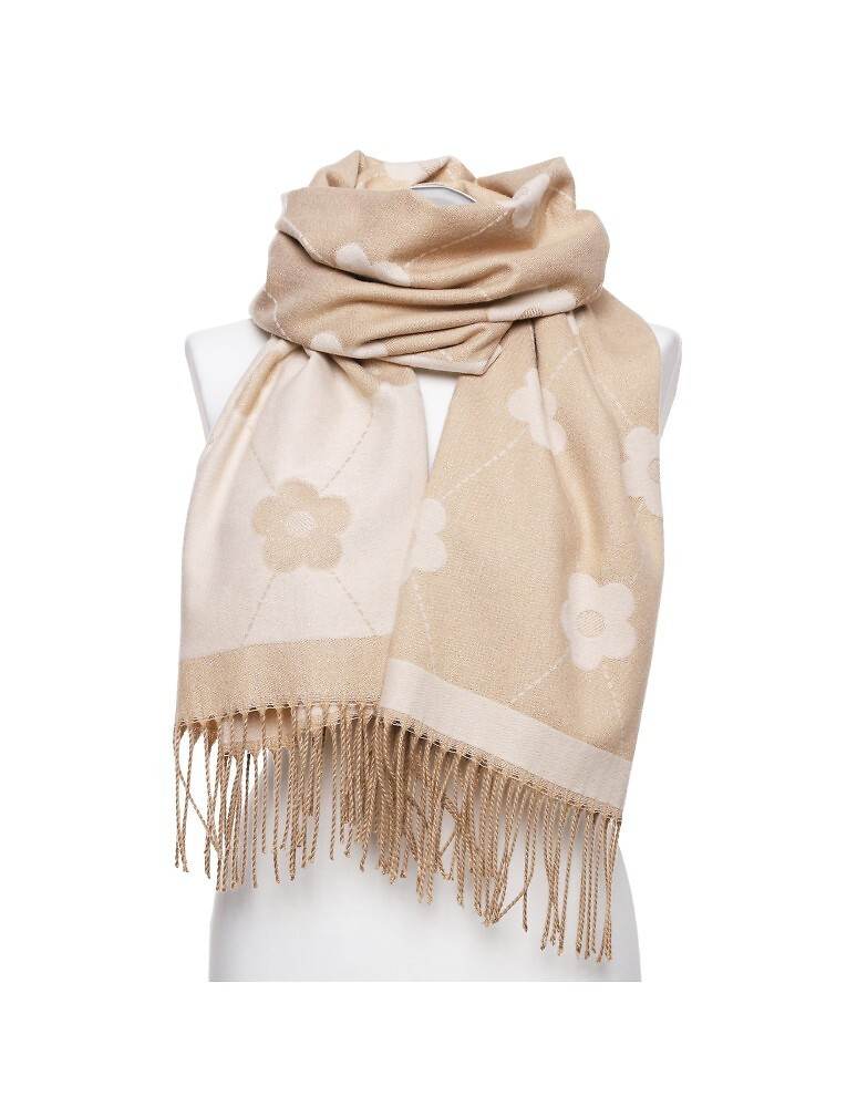 Dámska šatka s kvetinovým vzorom a strapcami - z mäkkej tkaniny, ktorá sa obtáča okolo krku - zdobený zlatou niťou - jemné strapce dodávajú šatke pôvab a podčiarkujú jej módny a zároveň klasický charakter - vďaka svojmu univerzálnemu dizajnu a pastelovým farbám sa dokonale hodí k mnohým štýlom - jemný kvetinový vzor -rozmery: 65x185 cm Tkanina: 100 % polyester