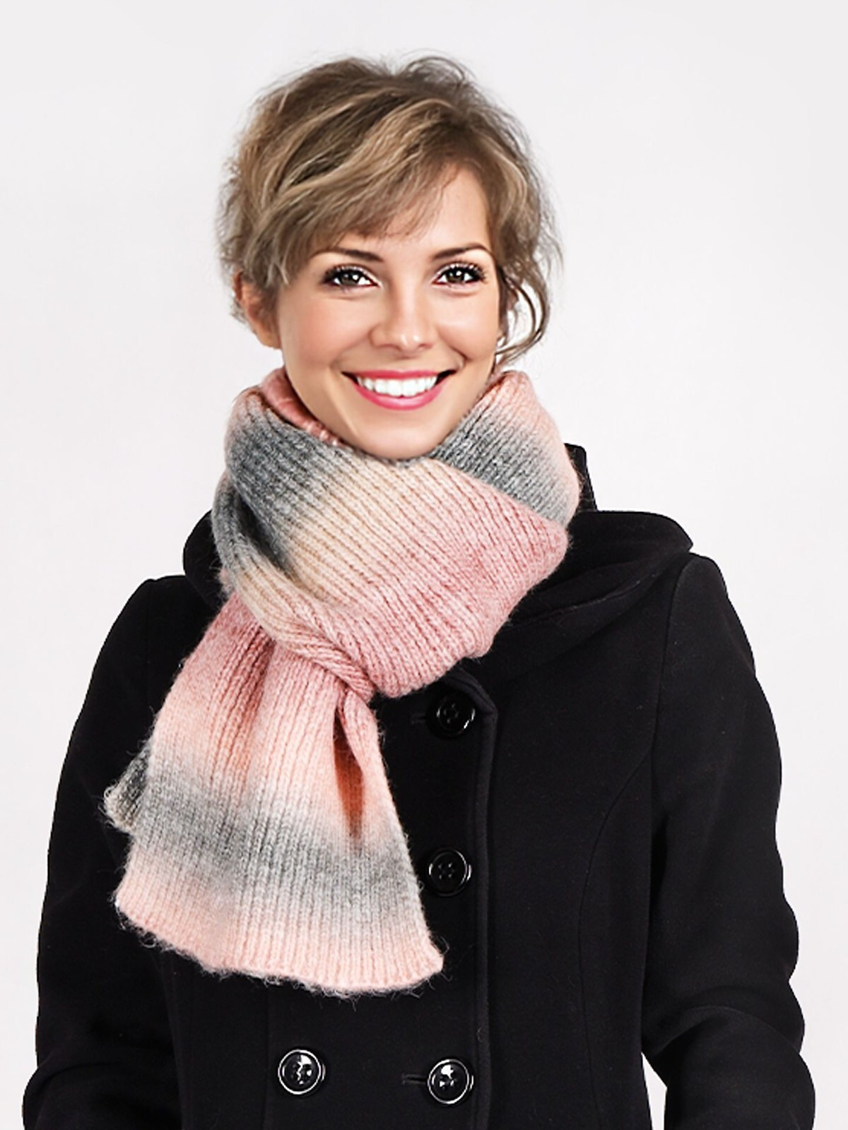 Dámska dlhá šatka - príjemná, mäkká pletenina - farebné odtiene: ružovo-šedo-béžová Zloženie: 50% akryl, 29% polyester, 9% polyamid, 4% vlna