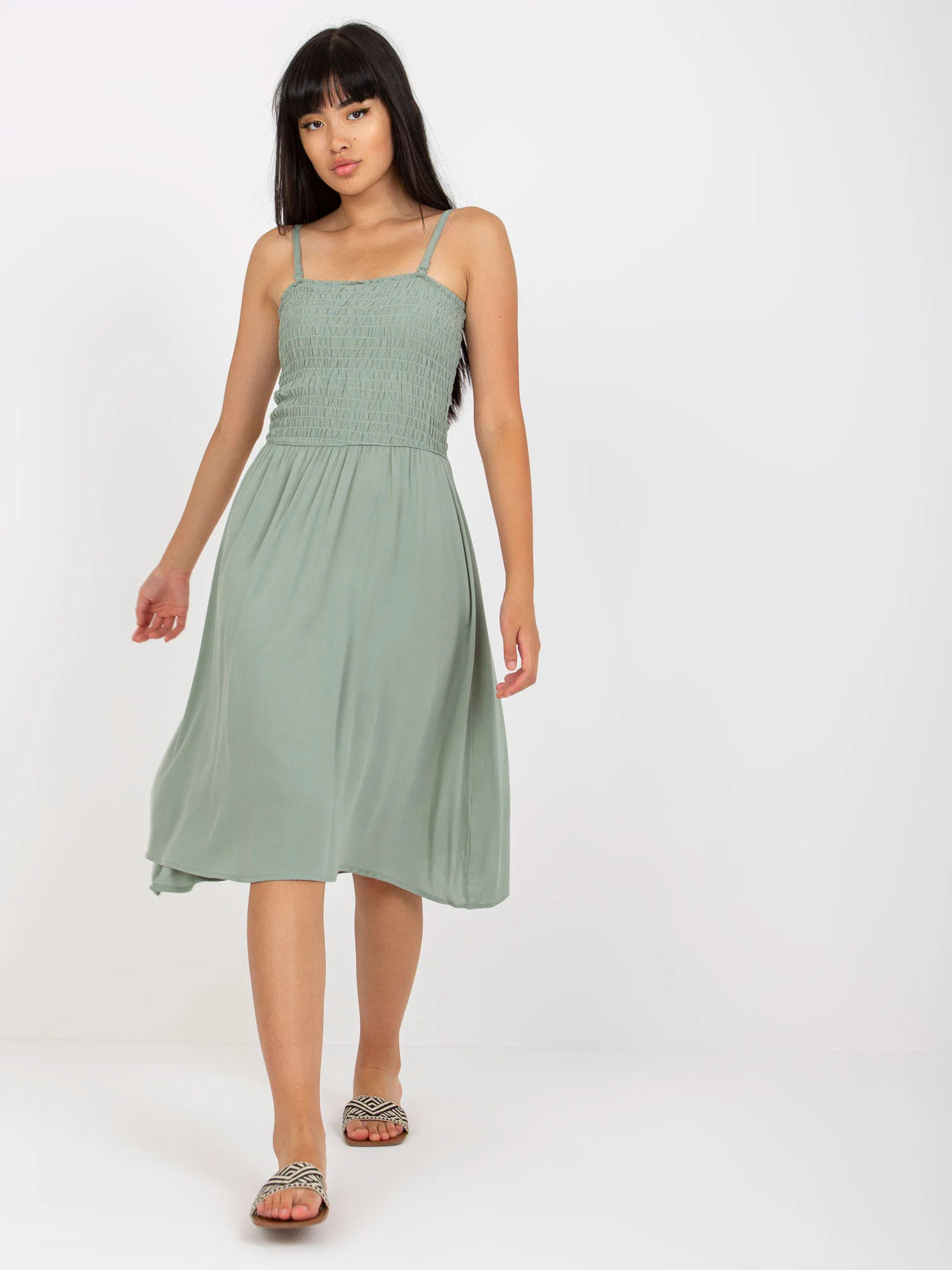 Khaki midi šaty bez ramienok FRESH MADE . príslušenstvo: nastaviteľné ramienka, elastický pás zloženie látky: 100 % viskóza spôsob prania: pranie v práčke pri 30 °C kód produktu: D73761M30314A dominantný vzor: jednofarebný štýl: ležérny príležitosť: ležérne, do práce, do mesta, na leto Modelka má na sebe veľkosť S/M Rozmery modelky: výška 167 cm, prsia 73 cm, pás 64 cm, boky 91 cm. Rozmery šiat vo veľkosti S/M merané na plocho: šírka v podpazuší - 34 cm, celková dĺžka - 85 cm.Medzinárodná veľkosťVýškaObvod hrudníkaObvod pásaM/L38-40162-17486-9178-90S/M36-38160-17282-8672-86L/XL40-42164-17891-9684-96