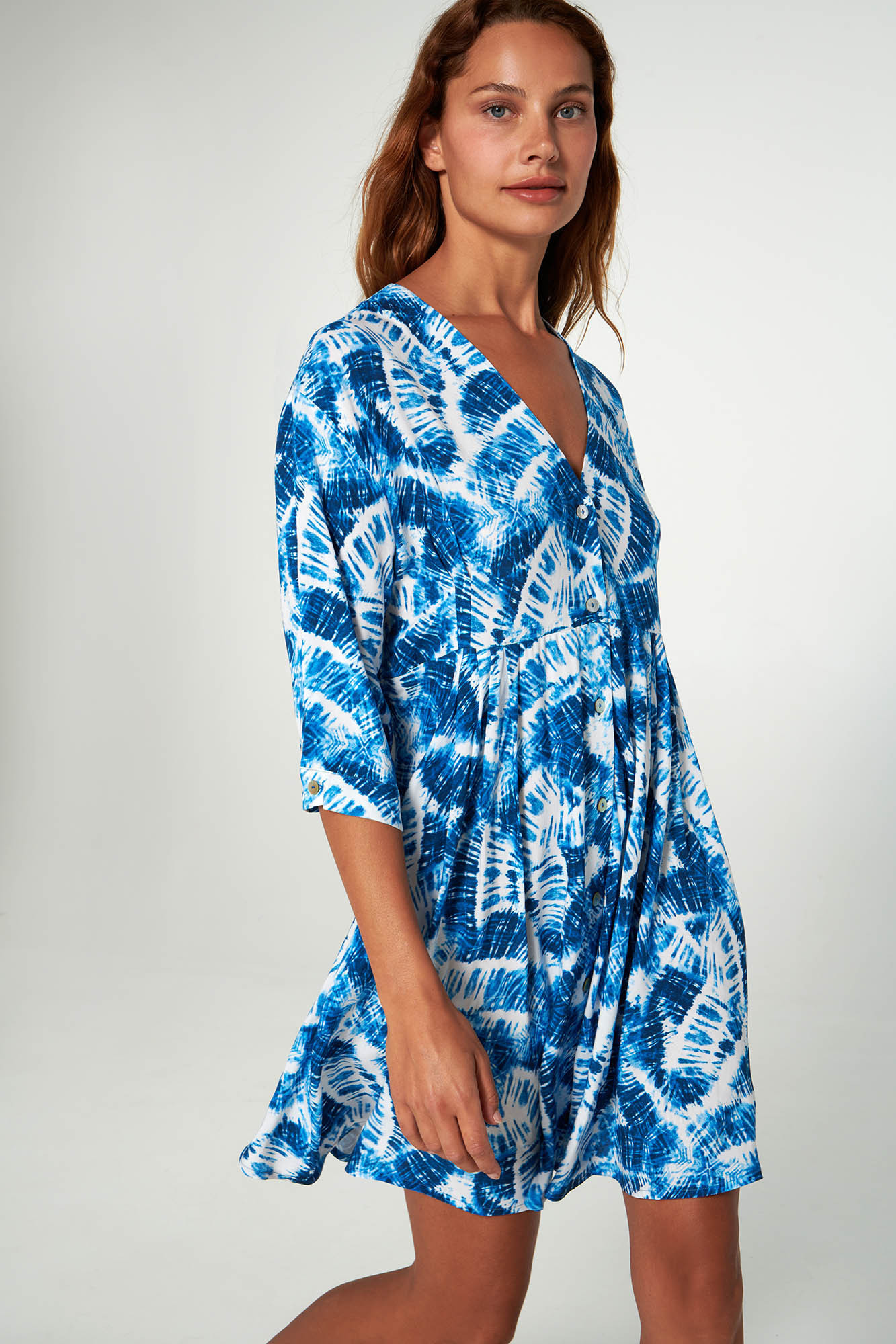 100% popelín - viskóza. Dĺžka: 90 cm. Model: výška 175 cm, veľkosť: Small. Kaftan s potlačou, zapínaním na gombíky, nariasenými rukávmi a výstrihom do V, voľný strih. Ľahký a chladivý, bude vašou jasnou voľbou na letnú dovolenku.
