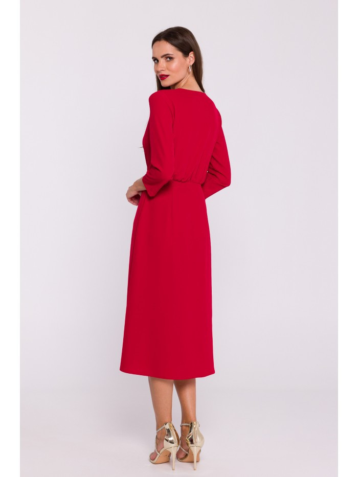 Tkané šaty so zavinovacím vrchom vysoký predný rozparok s ozdobnými gombíkmi 7/8 rukávy s dĺžkou pod kolená skrytý bočný zips bez podšívky náš model je vysoký 174 cm a nosí veľkosť S navrhnuté a vyrobené v Poľsku Materiálové zloženie: 95 % polyester 5 % elastan VEĽKOSŤ S M L XL XXL A 36 cm 37cm 38cm 39cm 40cm B 43cm 45,5cm 48cm 50,5cm 53cm C 35cm 37,5cm 40cm 42,5cm 45cm D 50cm 52,5cm 55cm 57,5cm 60cm E 47cm 47cm 47cm 47cm 47,5cm F 120cm 122cm 124cm 126cm 128cm G 40cm 40,5cm 41cm 41,5cm 42cm
