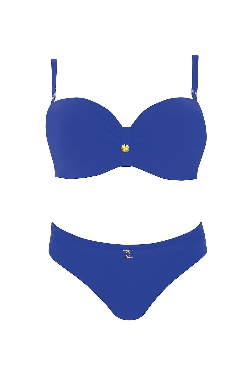 Plavky, dvojdielne - hladká podprsenka, s vystuženými košíčkami, s kosticami - push-up vo veľkostiach: 36C/D, 38B/C, 40C,42B - odnímateľné, nastaviteľné ramienka, zdobené zlatými prvkami - zadná časť s nastaviteľným obvodom, zapínanie na klipsy - hladké nohavičky, zdobené pásikom a šperkovým prvkom - odolné voči chlóru Zloženie: 85 % polyamid, 15 % elastan