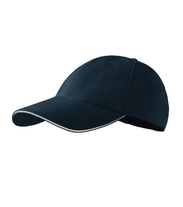šesťpanelový strih zosilnené 2 predné panely prešívaný, mierne zakrivený šilt s kontrastným prúžkom šité vetracie otvory potný pásik nastaviteľná veľkosť s mosadznou sponou