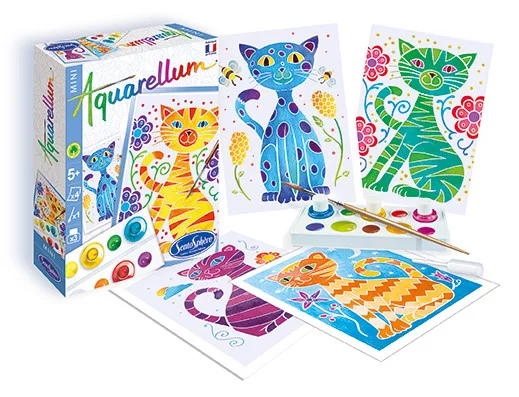 Kreatívna súprava na maľovanie akvarelom s motívom mačiek. Súprava obsahuje predlohy s maskovanými obrysmi a základné pomôcky na miešanie farieb a tvorbu drobných ilustrácií.
