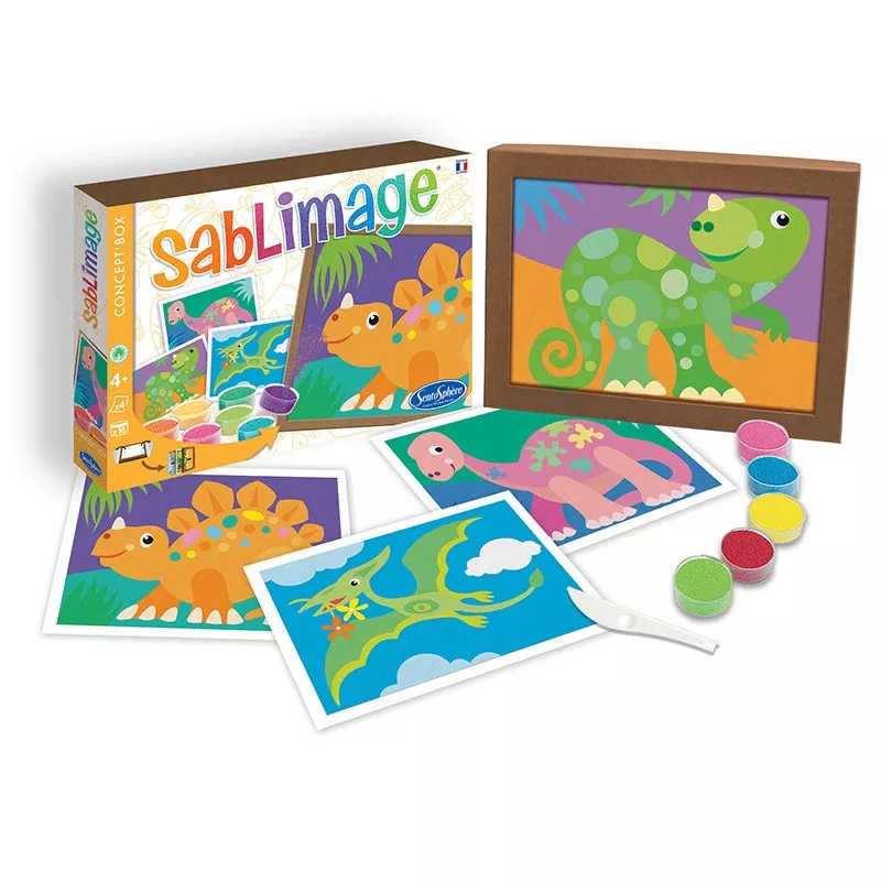Bavte sa pomocou jemného piesku a kreatívneho tvorenia so sadou Sablimage – Pieskové obrázky: Dinosaury od francúzskej značky Sentosphere. Nasypaním farebného piesku na vopred vyrezané lepiace plochy premenia deti ilustrácie na žiarivé umelecké diela.