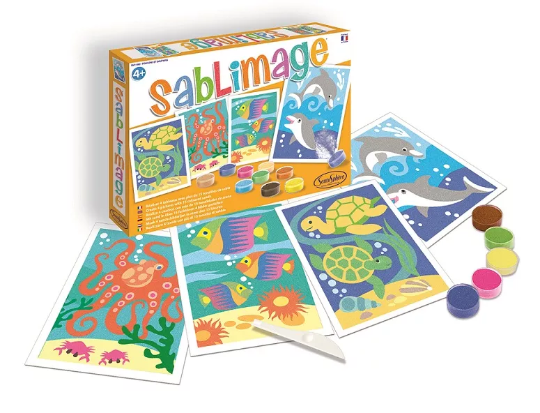 S touto súpravou sa otvára podvodný svet aj pre tých najmenších, a to bez ich zašpinenia. Deti si vyberú obrázok niektorého z morských živočíchov a postupne ho vyplnia farebným pieskom. Stačí odlepiť predlepené povrchy jednotlivých obrázkov a posypať ich rôznymi farbami piesku.