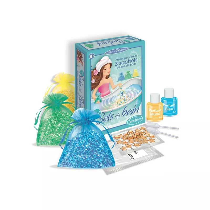 Zmiešajte podľa návodu rôzne vône, výťažky z rias, viacfarebné hviezdičky a hrubú soľ. Zmes vytvorí príjemnú kúpeľovú soľ pre relaxáciu a jedinečnú pohodu. Jednoduchá a bezpečná manipulácia umožní objavovanie výroby kozmetických výrobkov širokému spektru vekových kategórií.
