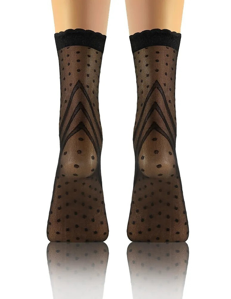 Tenké dámske ponožky - sieťovina - zdobené pútavým vzorom - netlačiaci lem zakončený volánom - balené po dva páry v plastovom vrecku Zloženie: 91 % polyamid, 9 % elastan