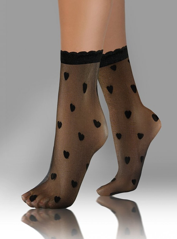 Tenké dámske ponožky - sieťovina - zdobené srdiečkovým vzorom - netlačiaci lem zakončený volánom - balené po dva páry v plastovom vrecku Zloženie: 91 % polyamid, 9 % elastan