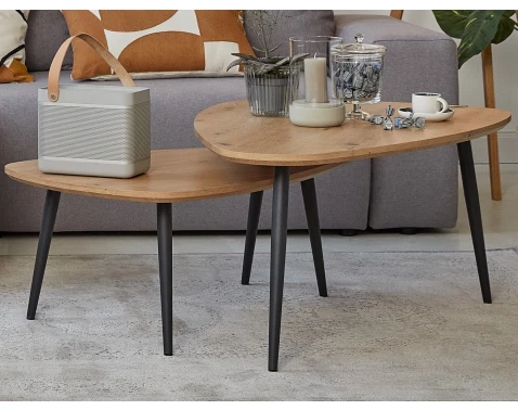 Set 2 konferenčných stolíkov rôznych veľkostí v drevodekore dub artisan. Môžete ich umiestniť k sebe alebo samostatne, s filigránskymi antracitovými nožičkami.
