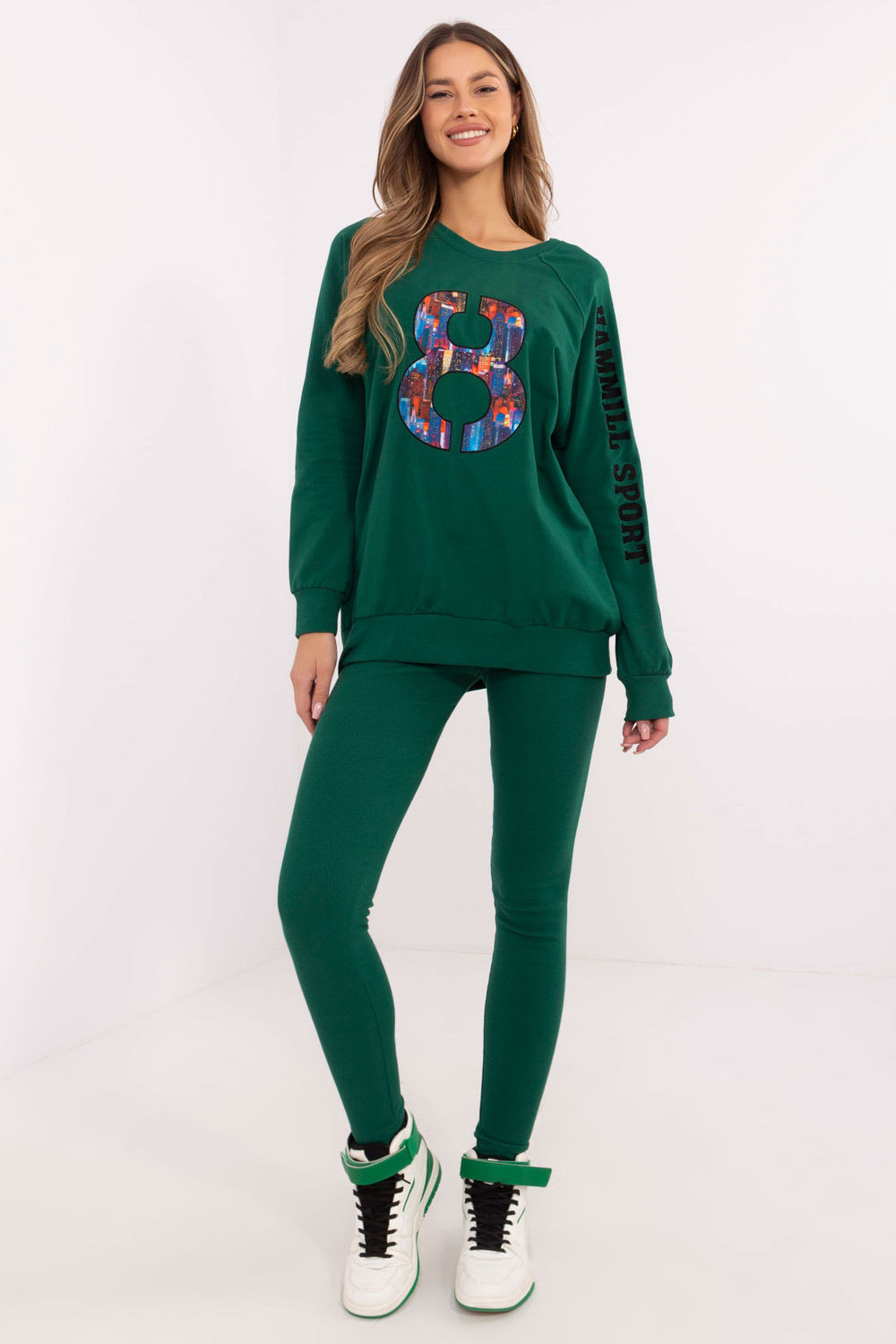Dámský set skládající se z mikiny a legín je skvělým návrhem na každodenní, ležérní stylizace. Ideální pro ženy, které ocení pohodlí a zároveň chtějí vypadat módně a stylově. Mikina klasického střihu s kulatým výstřihem a dlouhým rukávem je vyrobena z vysoké kvality směsi bavlny, polyesteru a elastanu. Je příjemná na dotek, elastická a odolná, což zajišťuje pohodlí nošení po celý den. Jemné aplikace a vyšívání na rukávu a přední části jí dodávají výjimečný charakter, zdůrazňující moderní design. Legíny se zužujícími nohavicemi a vysokým pasem jsou ideálním doplňkem setu. Vyrobeny z bavlny s příměsí elastanu se perfektně přizpůsobují postavě, zajišťují plnou volnost pohybu a pohodlí. Celkově drží hladký vzor, což z něj dělá univerzální a snadno kombinovatelný s různými doplňky. Je to perfektní volba na každodenní vycházky, relaxaci nebo aktivity v uvolněném stylu. Složení materiálu: Mikina: 72% b Veľkosť DĺžkaObvod pása Obvod hrudníka Obvod pása univerzálny74/101 cm110 cm124 cm58-96 cm