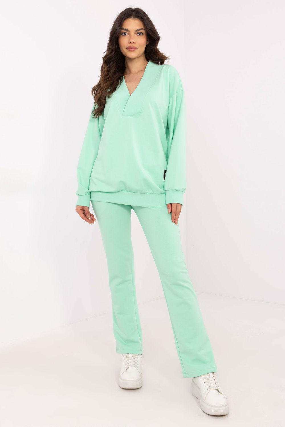 Táto dámska súprava je ideálnou voľbou na každý deň a spája pohodlie s minimalistickým štýlom. Skladá sa z mikiny s dlhými rukávmi a širokým výstrihom v tvare srdca, ktorý celku dodáva ženský nádych. Jemné aplikácie na mikine sú módnym detailom, ktorý priťahuje pozornosť. Nohavice s jednoduchým strihom, vysokým pásom a širokým elastickým pásom zaručujú dokonalé prispôsobenie a pohodlie pri nosení. Vsúvacie bočné vrecká sú nielen praktické, ale zároveň zdôrazňujú ležérny charakter súpravy. Celá súprava je vyrobená z mäkkej zmesi bavlny, elastanu a polyesteru, ktorá zaručuje pohodlie a odolnosť. Súprava je ideálna na prechádzky, nákupy alebo domáci relax a vďaka svojmu univerzálnemu dizajnu sa ľahko kombinuje s rôznymi príležitosťami. bavlna 72 %Elastan 6 %Polyester 22 % Veľkosť DĺžkaObvod bokov Obvod hrudníka Obvod pása univerzálny74/103 cm100 cm128 cm58-110 cm