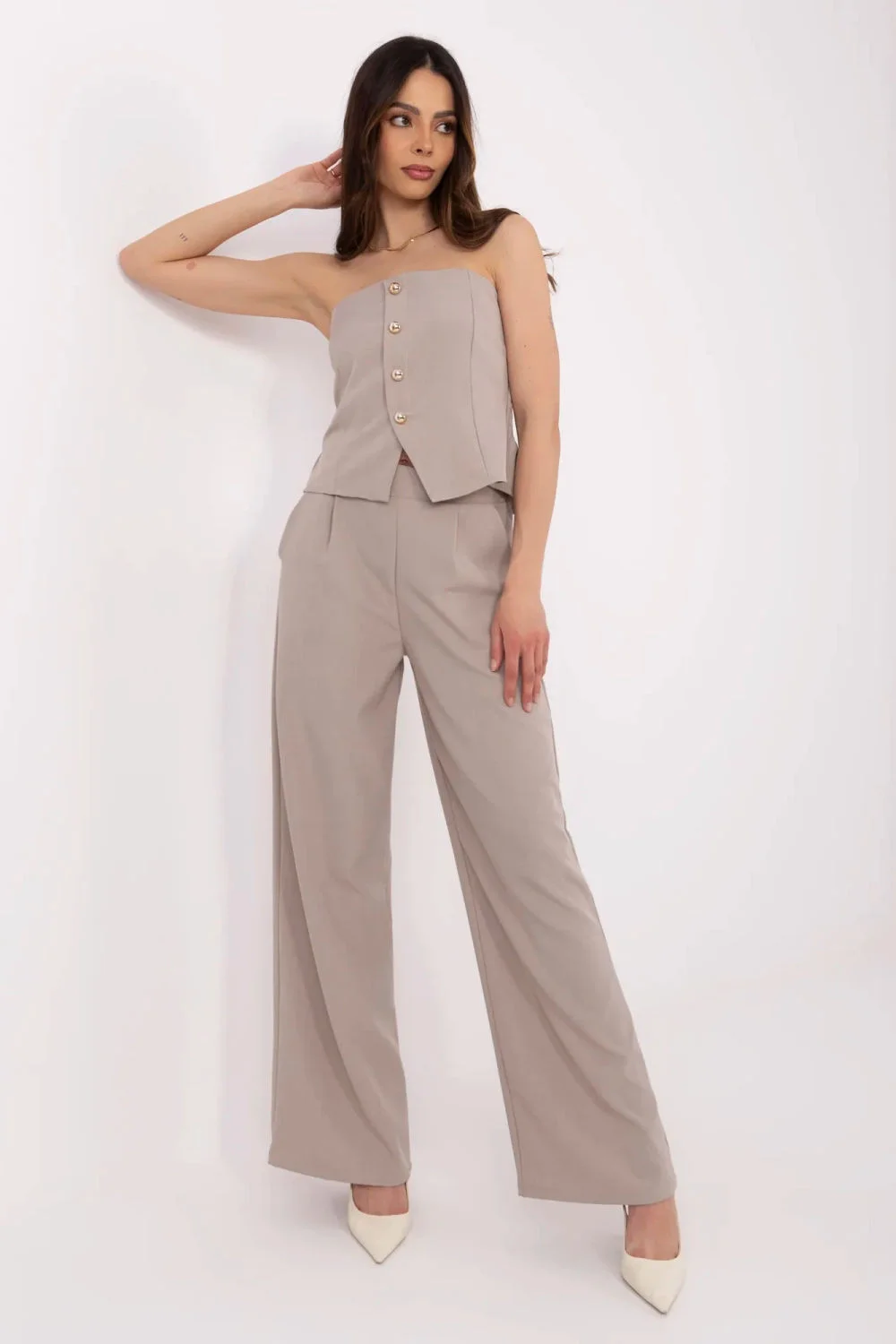 Stylový dámský komplet skládající se z vesty a kalhot je skvělou volbou pro ženy, které si cení elegance s nádechem modernosti. Ideální na každý den, do práce, na návštěvy nebo akce, bude se hodit všude tam, kde záleží na stylu a pohodlí. Vesta bez rukávů s španělským výstřihem je zdobena dekoračními knoflíky vpředu a efektními nařasenými detaily na zádech, které dodávají siluetě jemnou lehkost a zdůrazňují ženskou linii. Kalhoty s vysokým pasem a širokými nohavicemi opticky prodlužují nohy a krásně se pohybují. Vložkové boční kapsy jim dodávají funkčnost, aniž by narušovaly elegantní charakter celého setu. Vyrobený z hladkého materiálu, kombinace polyesteru a elastanu, zajišťuje komplet pohodlí a styl po celý den. elastan 5 % Polyester 95 % Veľkosť DĺžkaObvod bokov Obvod hrudníka Obvod pása univerzálny35/109 cm102 cm76-102 cm70-92 cm